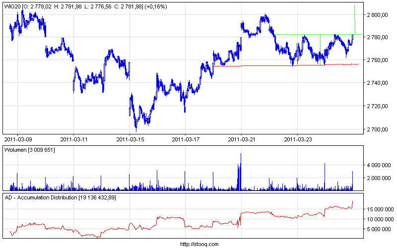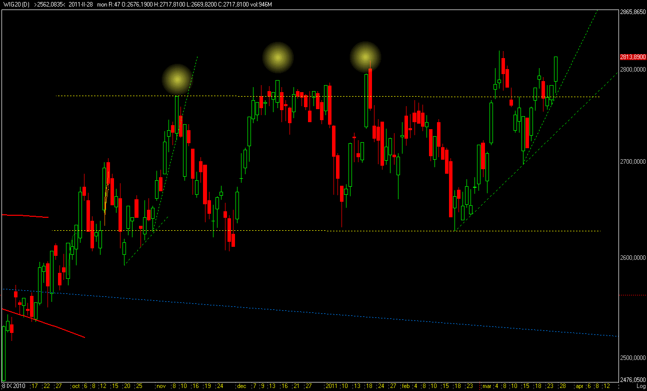 Bez względu jak nazwać to co się rysuje na w20 (podwójne dno, kanał boczny, prostokąt) to zasięg ruchu w przypadku wybicia jest jednakowy. Zwiększone obroty na czwartkowej sesji pokazują, ze być moze na gpw wrócił jakiś kapitał wiadomego pochodzenia, a rynek dostał szansę na przetestowania poprzedniego szczytu.