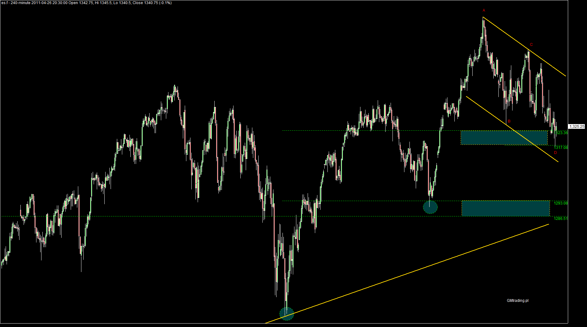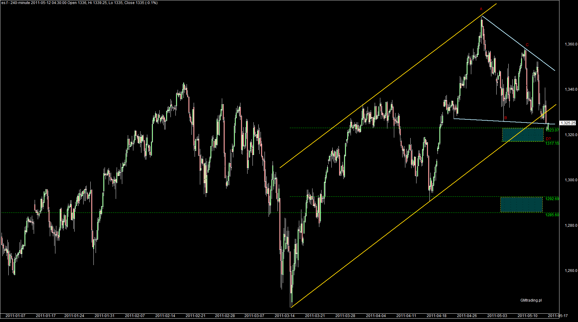 es.f po sesji, kontynuując wątek z porannego wykresu, widzimy , że strefa obrony popytu została wybroniona . Bardzo precyzyjnie zadziałała projekcja formacji harmonicznej ABCD na 1317 pkta. Dodatkowo możemy oznaczyć kanał spadkowy o wymowie flagi prowzrostowej . Na jutrzejszą sesję popyt ma zatem pole manewru do działania .