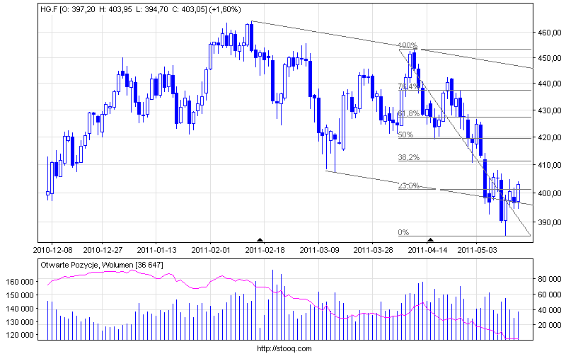 Na miedzi 23% uznaje za pokonane, nast. przystanek 38,2%. Ropa sie dzis wybronila, podobna sytuacja (odbicie od dolnego ograniczenia kanalu) na DOW, SP500, DAX. Bedzie roslo przez kilka sesji.