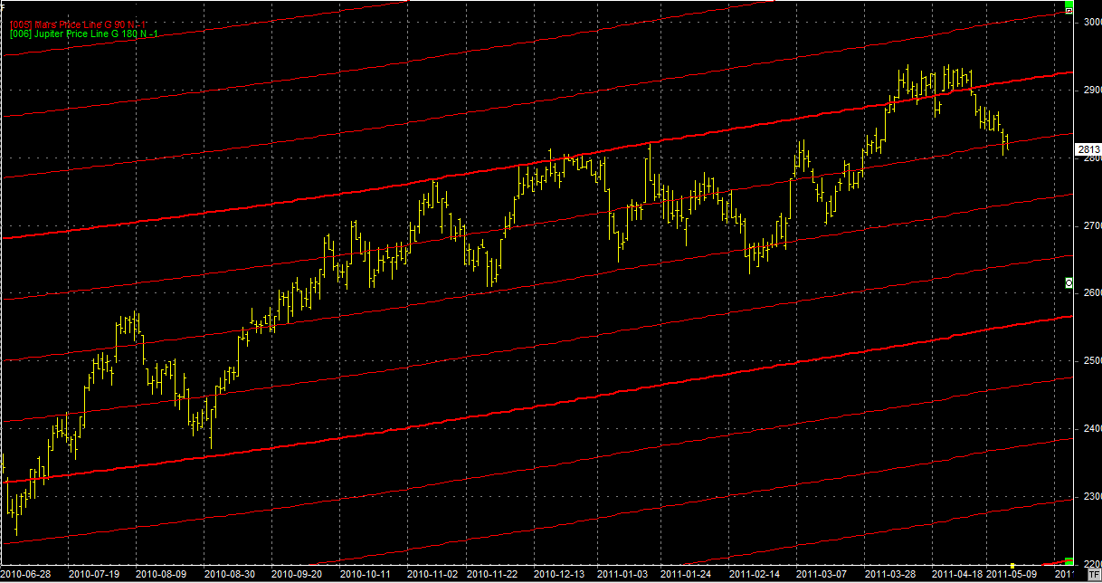 Na wykresie z liniami Marsa dotarliśmy do linii wsparcia o której pisałem w zeszłym tygodniu. Z tego poziomu powinno nastąpić jakieś odbicie ale forma byków na naszym rynku jest bardzo kiepska. Sądzę więc, że zatrzymamy się na wsparciu gdzieś do połowy tygodnia i pomaszerujemy dalej na północ. Chyba, że jakiś cudem wrócą siły witalne spekulantów. Wątpliwe to jednak, gdyż indeks W20 można z powodzeniem nazwać "surowcowo-bankowym", a obie te kategorie walorów nie są ostatnio "w cenie".