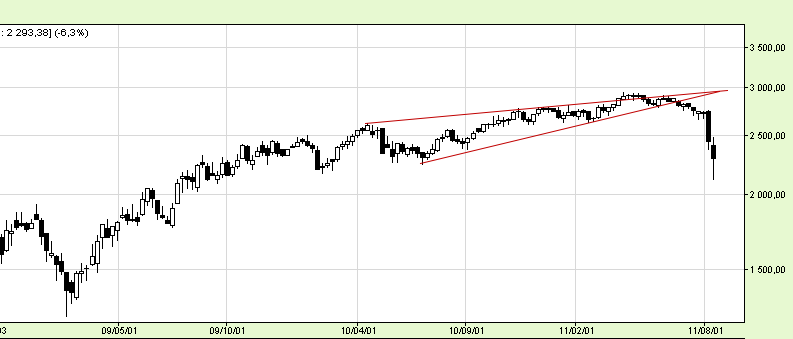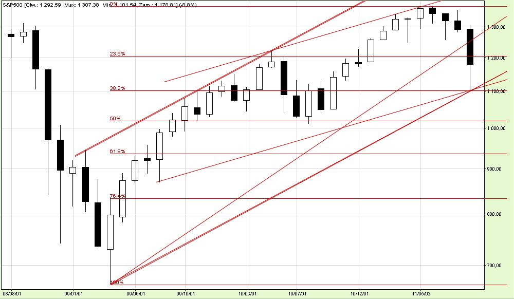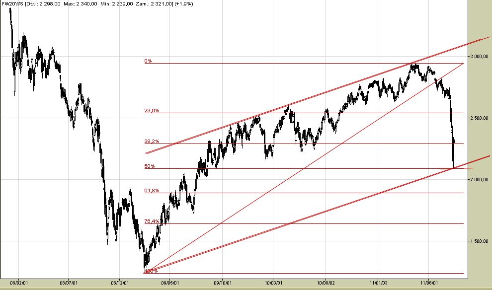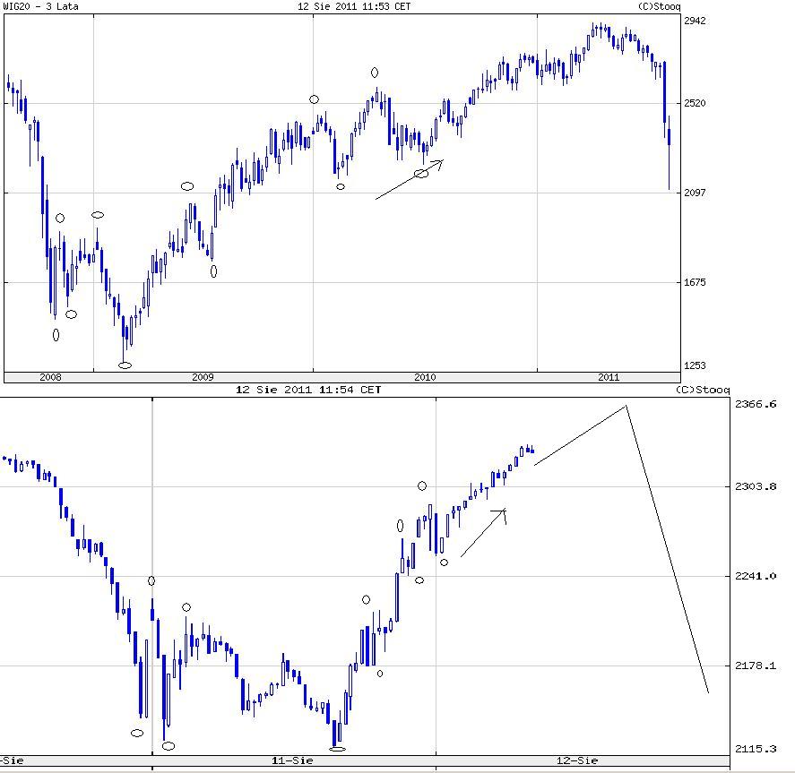 Bardziej prawdopodobny i bliższy rzeczywistości wydaje mi się odwrót od jakiegos poprzedniego opornika (ew. jakiegoś fibona) i napędzanie zwałki towarem podebranym na dołku. Pamiętajmy że ulica jest ciężko przestraszona i najmniejszy niepokój spowoduje wysypanie towaru “bo już odbiło”. Zagranie takie pozwoliłoby rozgrywającemu potrójnie zarobić w trendzie – na wyżej rozładowanych akcjach i wyżej wziętej eSie oraz wyjściu z zarobionych kilkadziesiąt pkt longów podmiotowi wspołpracującemu. Niczym nadzwyczajnym nie będzie wspomaganie ruchu na południe jakimś wydarzeniem makro bądź kolejna plotką. Scenario takie pozwoli wyrysować 5 falę (niewykluczone że z nowymi minimami ruchu) po ktorej powinno przyjść jakieś wieksze uspokojenie.