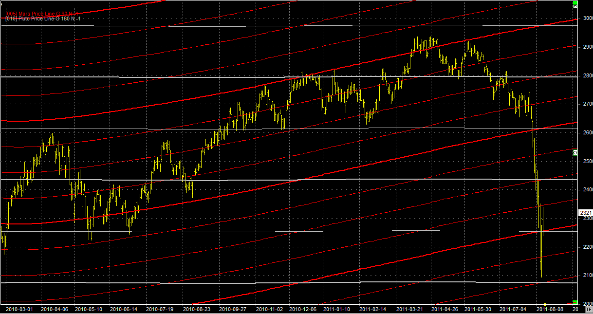 Na wykresie z liniami Marsa denko się urwało. Od momentu utraty wsparcia na linii Marsa w okolicach 2700 pkt spadliśmy o siedem pięter. Dawno nie widziałem takiego ruchu. Można go porównać jedynie do zwałki z 2008 roku. Nie jestem ekspertem od Astrofin ale na niebie nie widziałem jakiegoś ciężkiego aspektu. Przynajmniej nie na tyle ciężkiego by spowodować taki ruch. W zeszłym roku mieliśmy do czynienia z kilkoma fatalnymi aspektami Saturna i Plutona a rynki sobie spokojnie rosły. Póki co histeria jest nakręcana głównie poprzez media, newsy i plotki z Twittera (sic!). Taką sytuacje przewiduje jedna z fal w trójkątach, ale o tym można przeczytać w analizie elliotowskiej w serwisie AstroElliott. Jeżeli chodzi o wykres z liniami Marsa to ostatni dołek został wyznaczony w okolicach wsparć na linii Marsa i Plutona na poziomie 2100 pkt. Odbicie jest na oporze i w tym tygodniu oczekuję jakiegoś odejścia spadkowego. Nie sądzę jednak by korekta wzrostowa zakończyła się na tym. Wydaje mi się, że po korekcie zobaczymy podejście do okolic 2450 pkt.