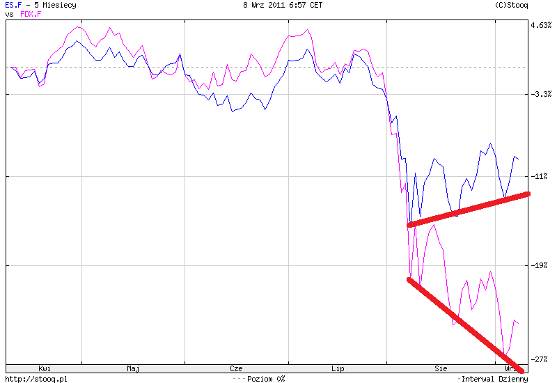 Natomiast porównanie siły relatywnej es.f i fdx.f pokazuje,że bomba grecka (i groźba rozpadu strefy euro), dalej tyka.