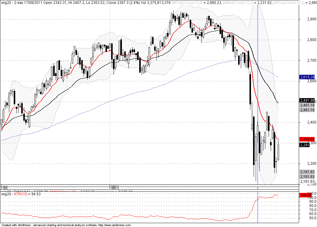 A teraz ciekawostka - czy widzicie podobieństwa pomiędzy wykresami? Pierwszy wykres pokazuje jak zachowywał się rynek spółek w20 po pierwszej fali bessy. Drugi pokazuje rynek na dziś. Analogia jest następująca - rynek musi się uspokoić i pójść w bok czemu będą sprzyjać banki centralne na świecie. Później kolejna fala w dół.