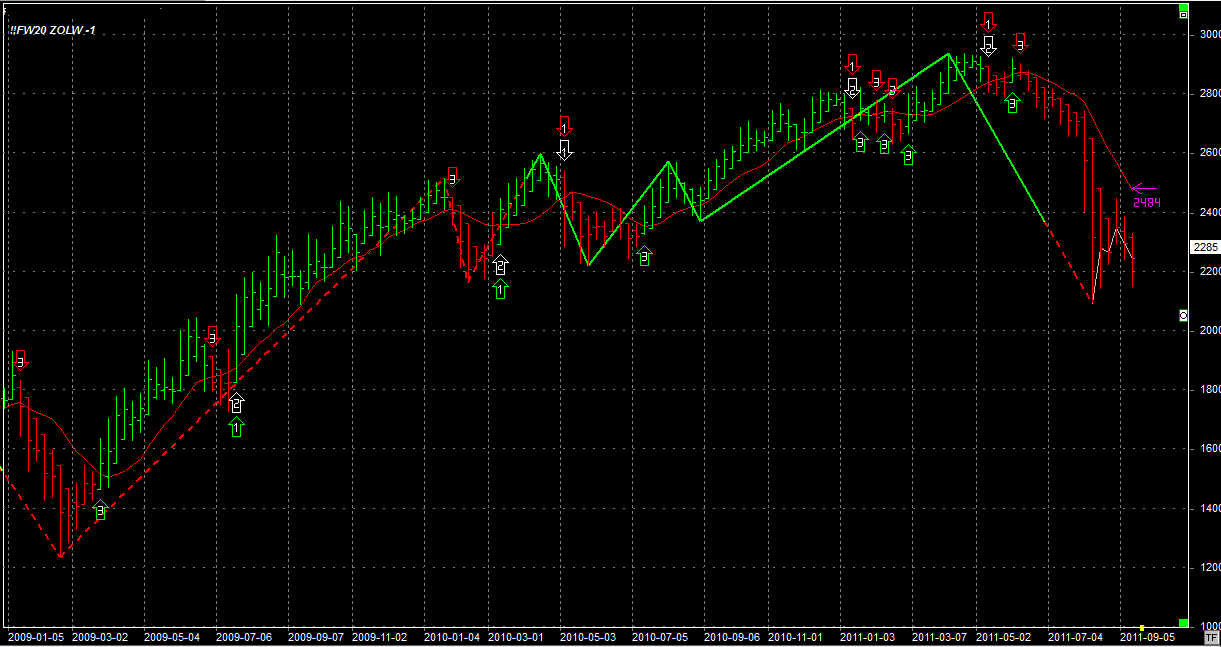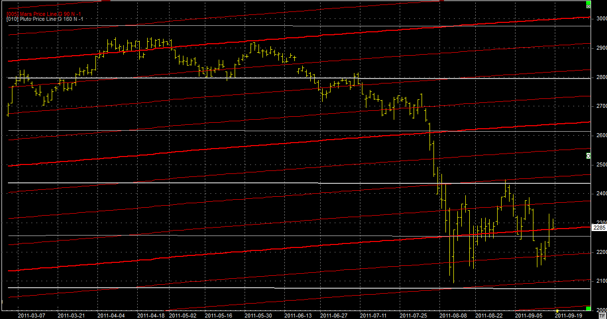 Na wykresie z liniami Marsa kurs kontraktów znalazł wsparcie na linii położonej w okolicach 2200 pkt i pomaszerował wyżej, przebijając opór na poziomie 2280 pkt. Sądzę, że na tym poziomie powalczymy trochę ale są szanse na kolejną windę w górę, może nawet w okolice 2450 pkt. Może nie w tym tygodniu ale tak to wygląda.