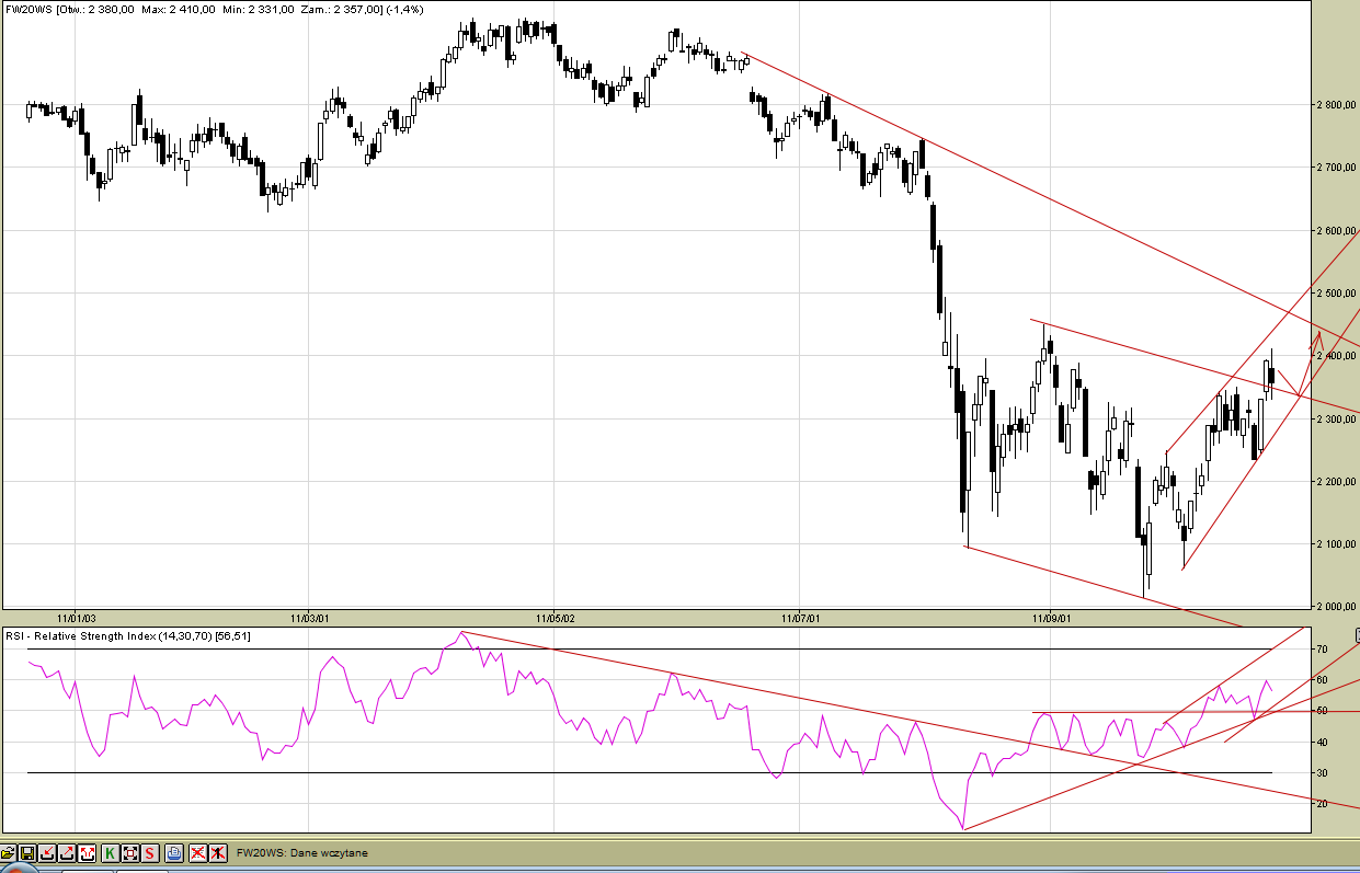 I mamy wygrzebanie się górą z konsoli czy tam flagi jak kto woli. Odwrót z czwartkowych minimów okazał się na tyle skuteczny, że wyszliśmy na nowe maksy ruchu. Co prawda jak to już nie raz obserwowaliśmy można utyskiwać nad poziomem obrotów ale wycena portfela nie jest pochodną wolumenu tylko poziomu cen. Skoro podaż nie atakuje to przy tak mizernych obrotach to nasz dobry znajomy korsarzyk ciągnie ten bałagan do góry. Minimalny zasięg na wigu 20 to spadkowa ale po drodze trzeba przejść 2450 :-)