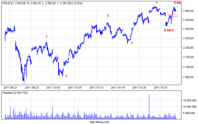 - czwartkowy szczyt (linia zielona), którego przejście wykończy kolejną falę impulsu (7), sugerującą, ze wzrosty od dołka mogą być dziewiątką.