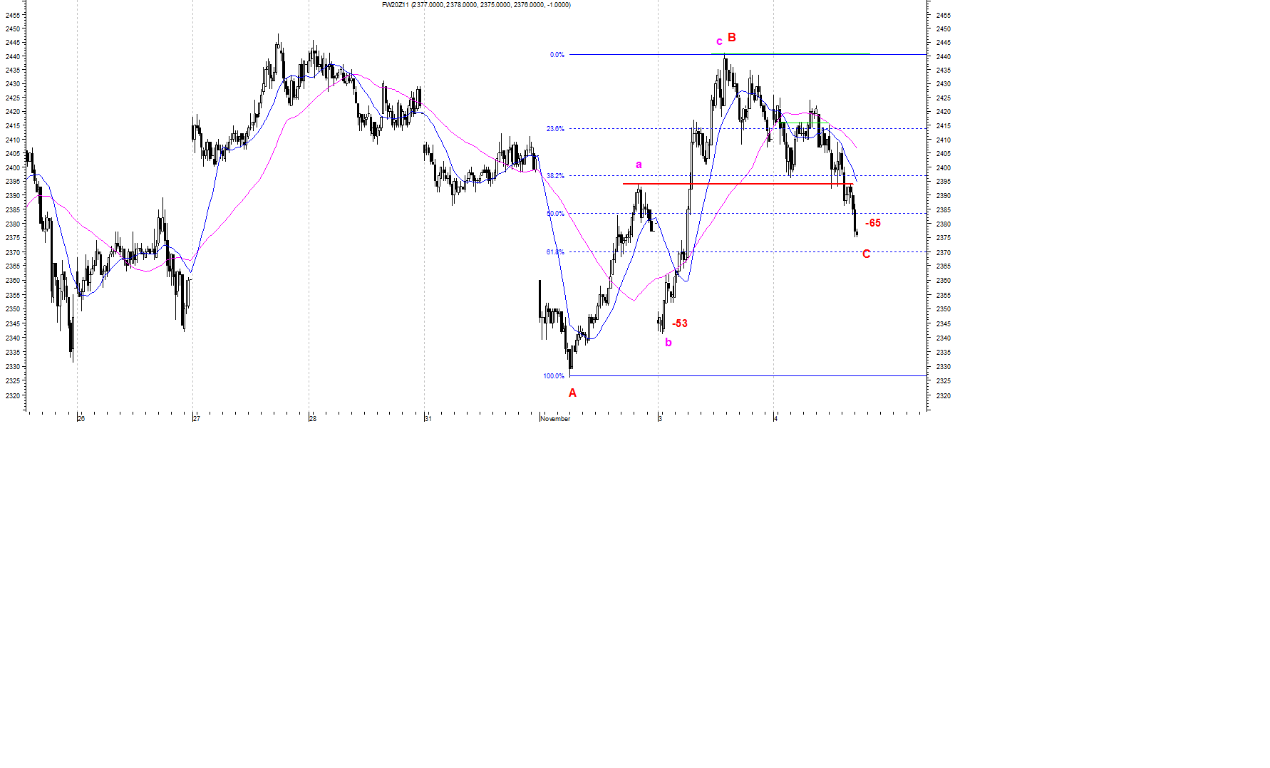 - odpadnięcie od tego poziomu i pokonanie pierwszej linii czerwonej pozwoli założyć, że po wzrostowej piątce robimy korektę ABC.
