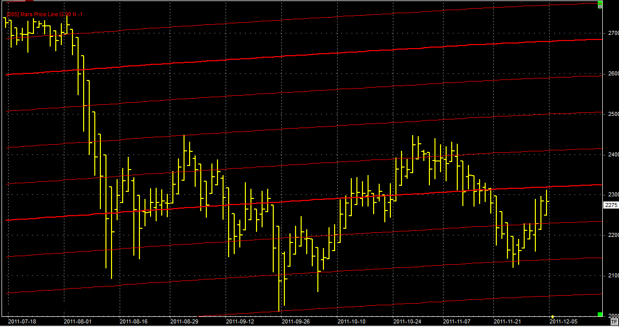 Na wykresie z liniami Marsa dotarliśmy do linii oporu w okolicach 2315 pkt. Wydaje mi się, że po ruchu o dwa poziomy powinniśmy zobaczyć jakieś odejście. Do samego oporu jednak zabrakło kilku punktów więc nie wykluczam jeszcze jednego ataku byków. Jego rezultat powie nam więcej o ich kondycji. Grudzień sprzyja podciąganiu indeksów więc nie stoją one na straconej pozycji.