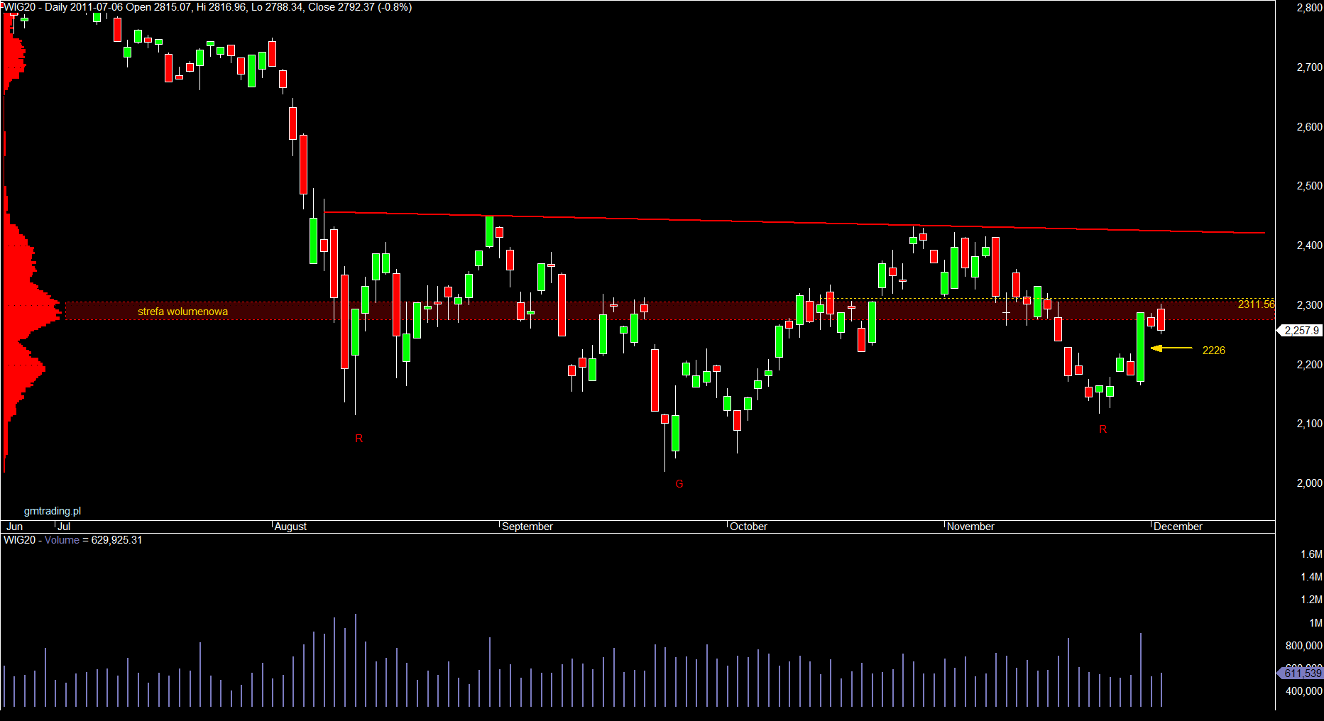 Od góry cały czas ruch ceny przytrzymuje tzw strefa wolumenowa, tuż nad nią mamy opór na poziomie 2311, jego wybicie przybliży nas do dokończenia rysowania formacji oRGR (tej od ślepej kury :) )
