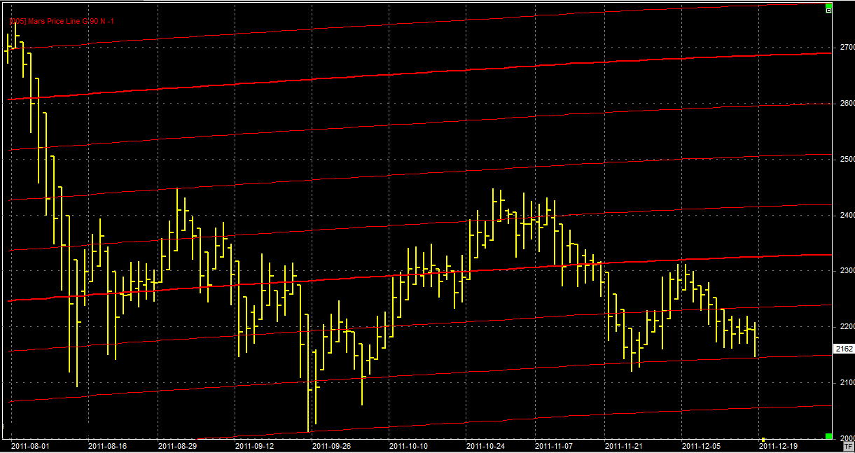 Na wykresie z liniami Marsa podejście z zeszłego tygodnia okazało się tylko retestem przełamanego wsparcia. W rezultacie mam zejście do okolic kolejnego i delikatne odbicie od niego. Odbicie to jest sztucznie wywołane zmianą serii na wykresie. Stara zamknęła się na poziomie 2127 pkt, a więc nawet poniżej. Różne sztuczki byku stosują by się jakoś bronić. Nowa seria, nowe rozdanie. Może się uda? Rynki już trochę wyprzedane są więc to zwiększa szansę obrony okolic 2150 pkt. Wg mnie tylko obrony. Trend jest zdefiniowany i na razie o jego odwróceniu nie ma mowy.