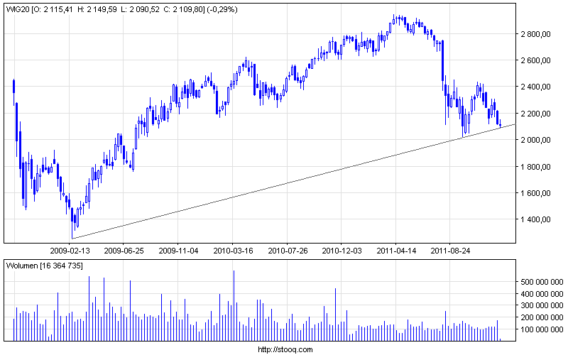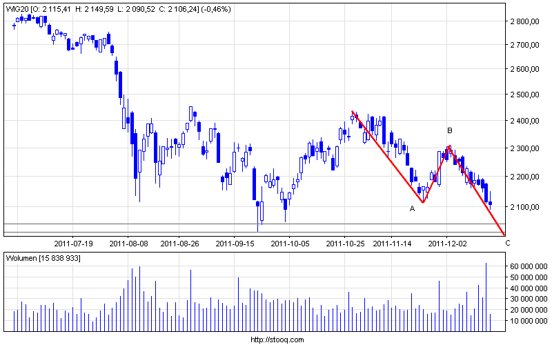 Jeśli miałbym pokusić się o luźne prognozy to spoglądając na wykres indeksu w perspektywie dwumiesięcznej można zaryzykować hipotezę korekty w postaci ABC gdzie fala B zniosła 61,8% fali A i przy zachowaniu zależności A=C widzimy się na poziomach lekko przekraczających ostatnie minima na 2019 pkt na indeksie. Naruszenie i powrót - brak powrotu przy ewentualnym pogłębieniu dotychczasowych minimów byłby tu potwierdzeniem bessy - wyraźnie spełniałoby założenia fałszywego wyjścia którymi byliśmy ostatnio nie raz zaskakiwani oraz pozwolił wskoczyć do pociągu najpierw łapaczom dołów a później obstawiającym kontynuację przeceny - co przy umiejętnym rozegraniu rynku (a zawodnik mający 30% towaru to na pewno potrafi) najpierw mogłoby stać się dodatkowym paliwem do pogłębienia zwałki a później w wypadku powrotu do wzrostów zamykania stratnych esek.