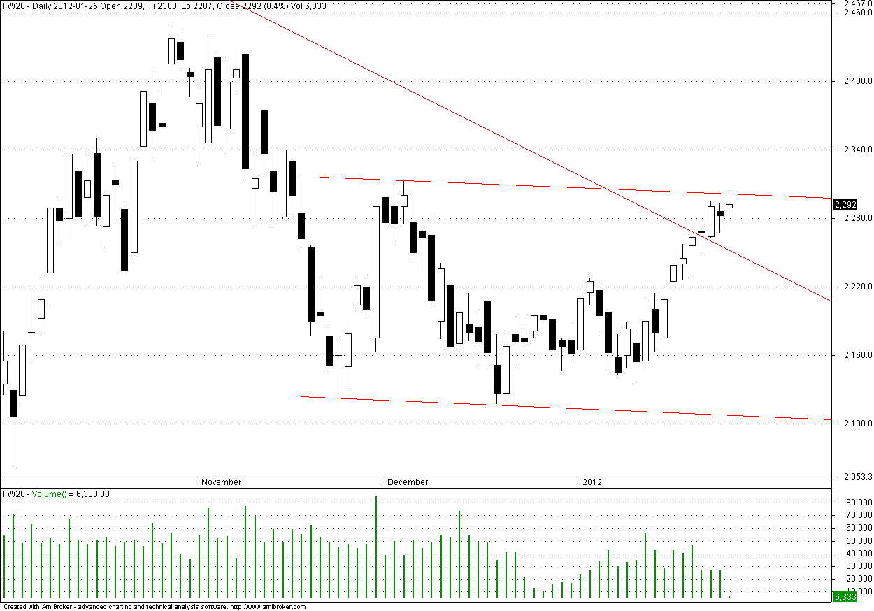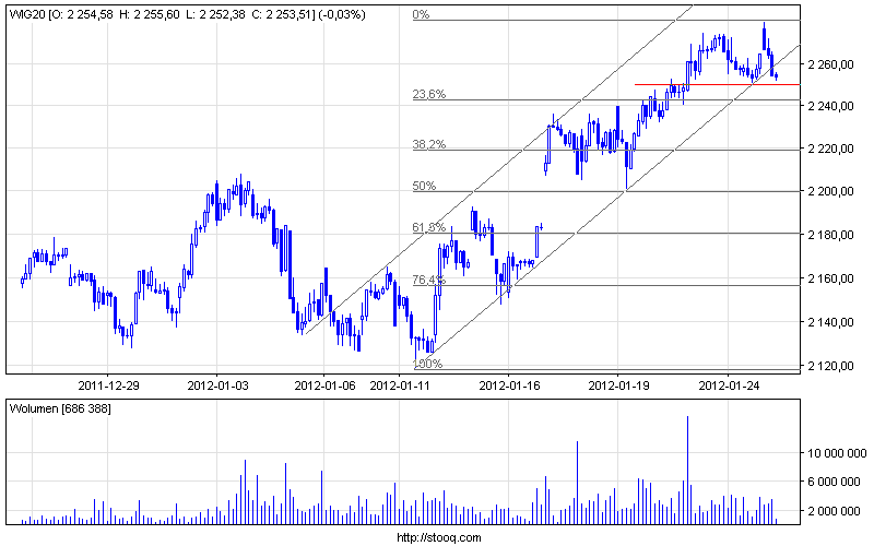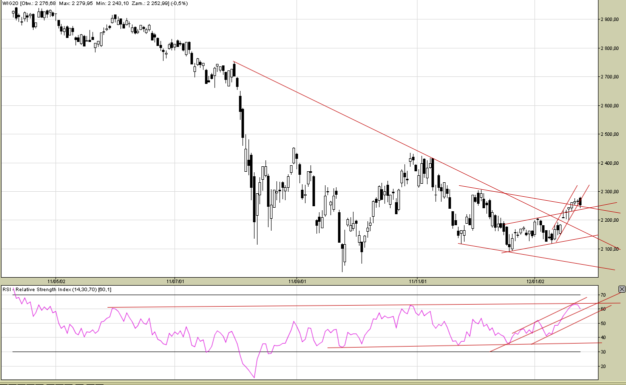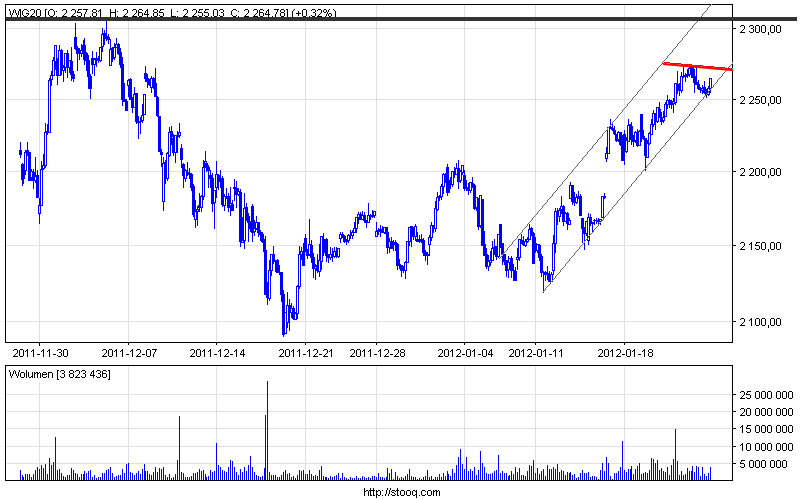 Jeśli przekopiemy oporowe wtorkowe maxy (na wykresie na czerwono) jest szansa na atak 2305 pkt (na wykresie na czarno) i zapewne po owocach spotkania przy tych poziomach poznamy golasa na najbliższe dni.