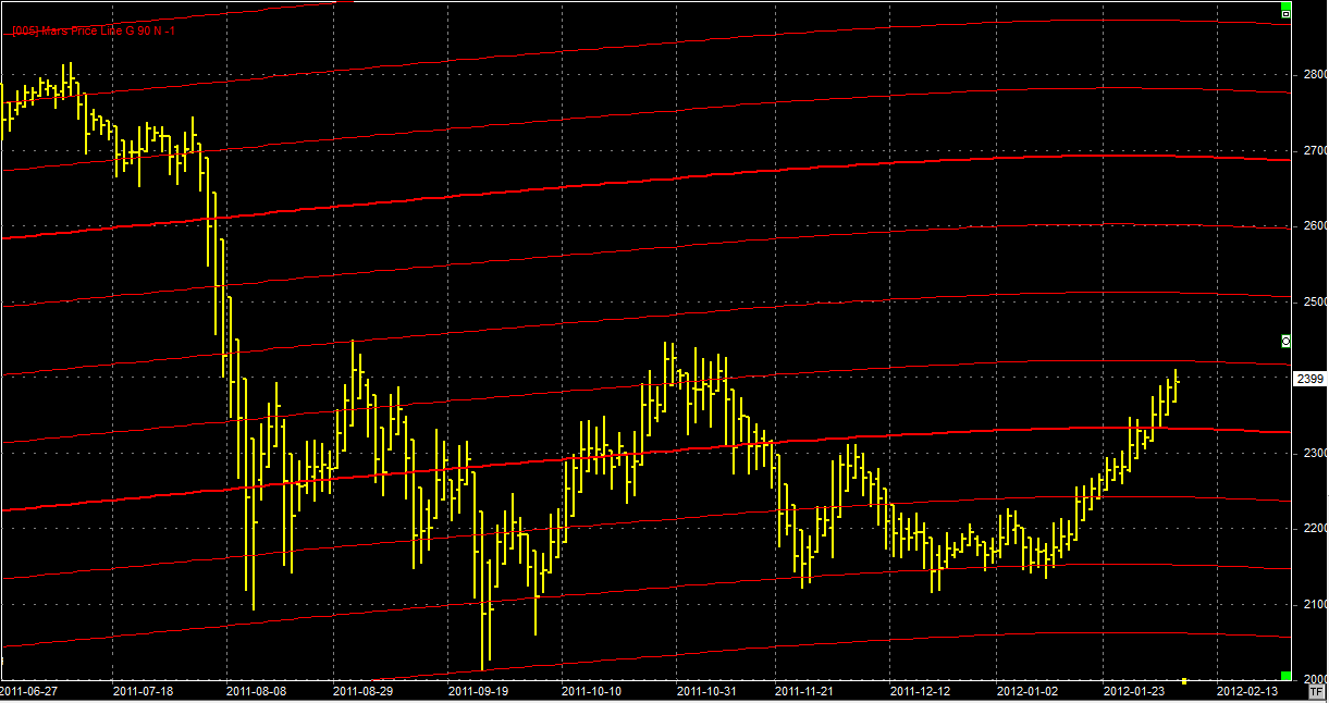 Na wykresie z liniami Marsa przystanek na poziomie oporu w okolicach 2320 pkt nie trwał zbyt długo. Indeks już we wtorek wybił się z konsolidacji i obecnie zbliża się do kolejnej linii Marsa w okolicach 2420 pkt. Linia ta do dość silny opór gdyż w ostatnim półroczu był testowany trzykrotnie i za każdym razem wyjście ponad okazywało się fałszywką. Z tego powodu uważam, że sforsowanie go "z marszu" będzie podobną fałszywką. Idealna dla byków byłaby konsolidacja przy szczytach, schłodzenie rynku i wybicie w późniejszym terminie. Podobnie jednak uważałem poziom niżej a rynek miał swoje zdanie. Jedno jest jednak dość znamienne - styczniowy ruch odbywa się w zasadzie bez większych korekt więc ta, gdy przyjdzie będzie moim zdaniem silna i gwałtowna.