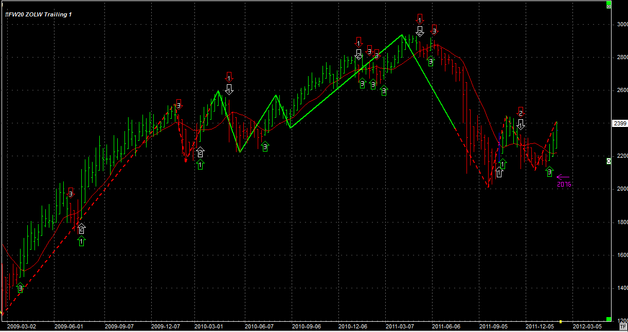 Tydzień zamknął się na poziomie 2399 pkt, 70 pkt wyżej niż tydzień temu. System utrzymuje pozycję długą 1 szt (przeciw trendowi) po 2267 pkt. Stop dla pozycji 2076 pkt.