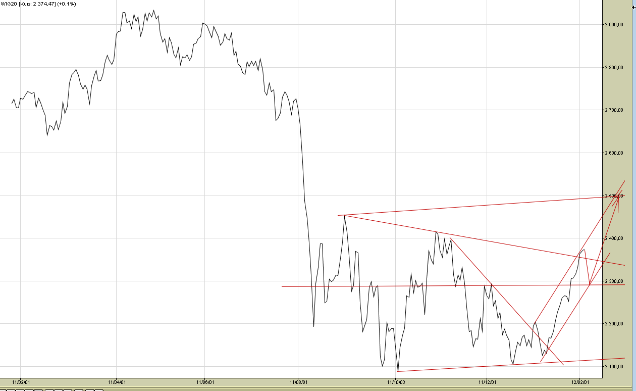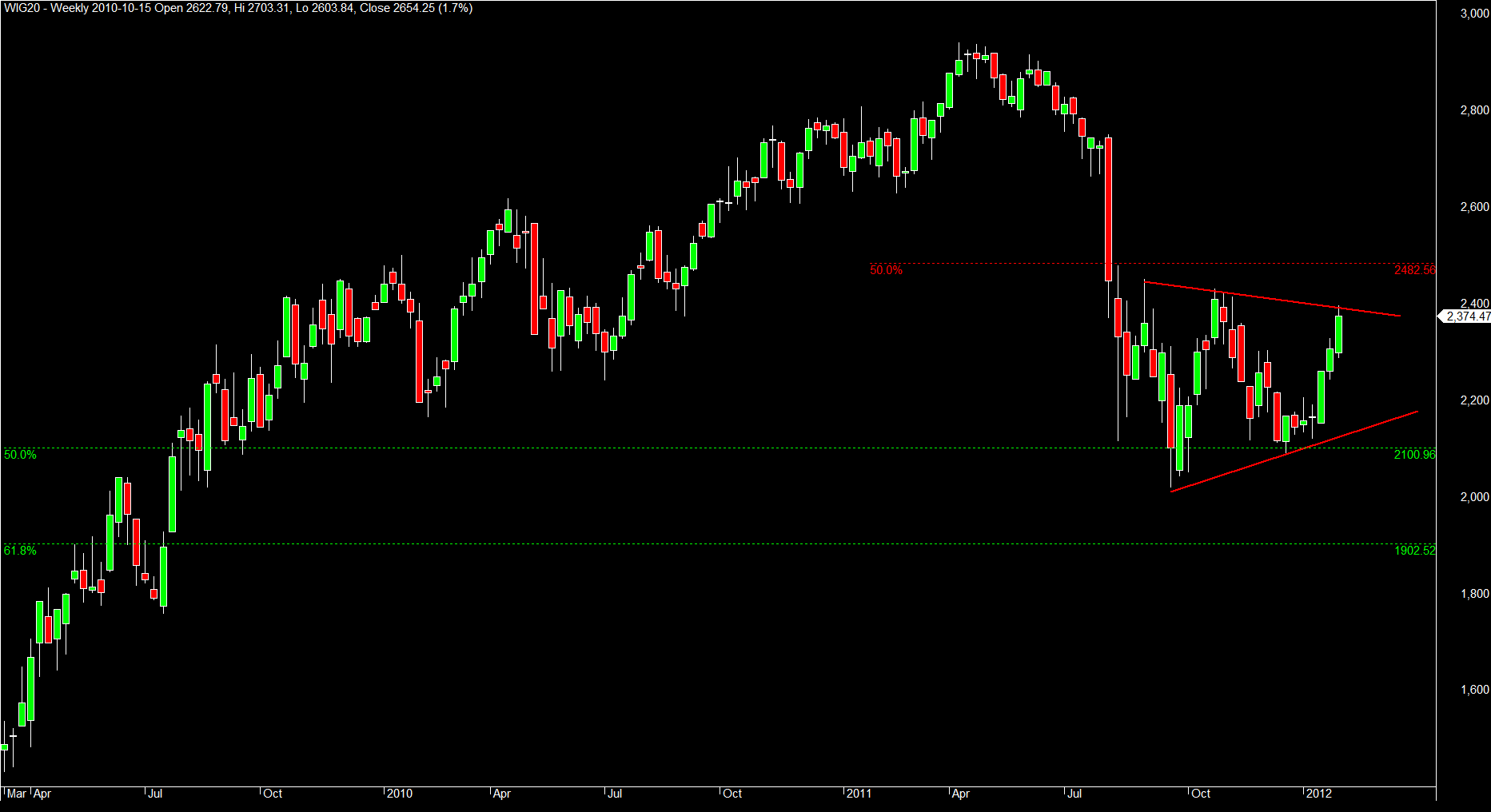 Cena doszła do punktu , który jest górnym ograniczeniem formacji trójkąta symetrycznego. Formacja ta w skali tygodniowej jest obecnie jedynym zagrożeniem dla popytu. Jak każda formacja może być zanegowana jak i potwierdzona. Nie mniej fakt jej istnienia należy mieć na uwadze. Trójkąt symetryczny jest zaliczany do formacji kontynuacji cytata :) "Trójkąt symetryczny częściej zapowiada kontynuację wcześniejszego ruchu niż jego odwrócenie ..." Koniec cytata :). Czekamy na dalszy rozwój wydarzeń.