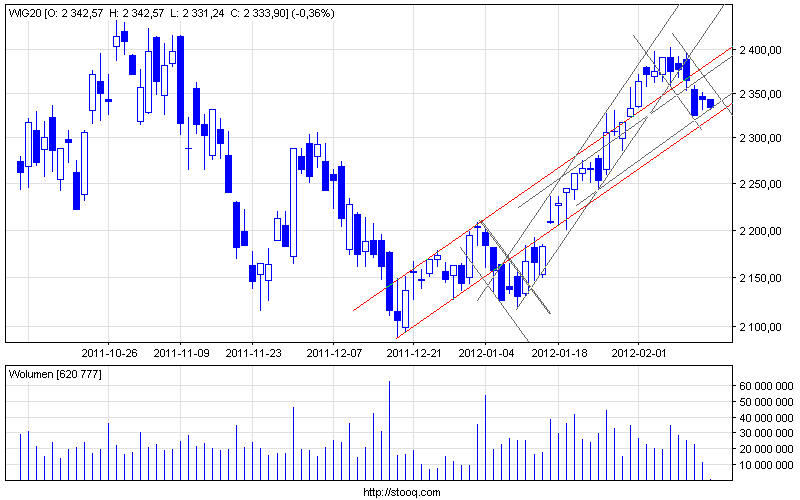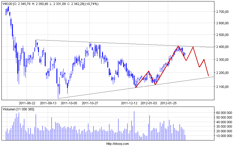 Jak to zwykle w poniedziałek szału nie było. Cały dzień upłynął na próbach zastopowania i graniczenia dotychczasowej przeceny. Nadzwyczaj skromne obroty nie pozwoliły na wyciągniecie zbyt daleko idących wniosków. Z punktu widzenia zwolenników Elliotta można pokusić się o zaryzykowanie oznaczenia obecnego ruchu jako 4 fala w pięciofalowym impulsie. Idąc tym tropem jeśli to korekta korekty to zaliczymy jeszcze jedno minimum aby później zaliczyć kolejne podejście pod maksima (jako fala 5) a jeszcze później zaliczyć głębszą niż dotychczasowa korektę (jako ABC). Nawet nieźle wpisuje się to w obecny długoterminowy układ techniczny, gdzie nadal przebywamy w trendzie bocznym w półrocznym trójkącie czekając na wybicie potwierdzające dominację którejkolwiek ze stron.