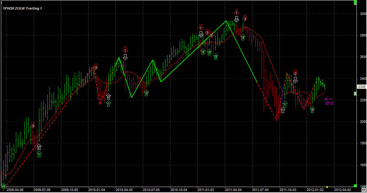 Tydzień zamknął się na poziomie 2326 pkt, 3 pkt wyżej niż tydzień temu (sic!). System utrzymuje pozycję długą 1 szt (przeciw trendowi) po 2267 pkt. Stop dla pozycji 2212 pkt.