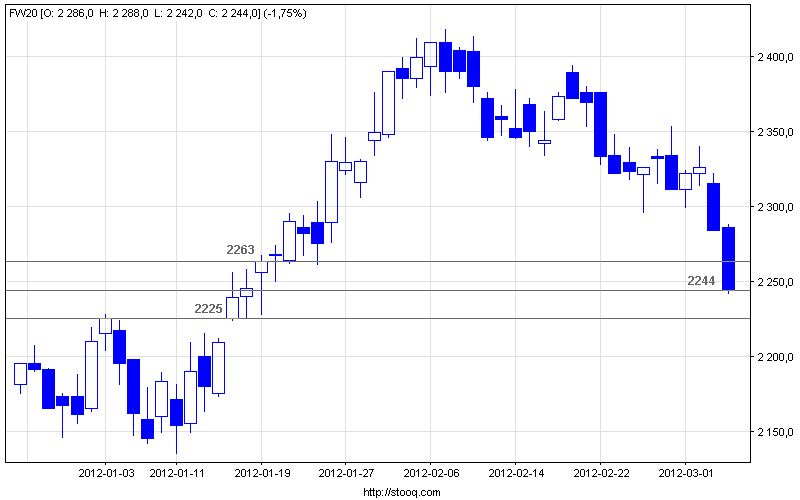 Kontrakt zamknął się na połowie białego korpusu wyrysowanego świeczkami z 17-19 stycznia. Niższe zamknięcie będzie oznaczało ciąg dalszy zaniżania przed odpałem