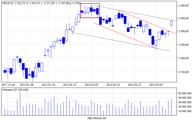 Techniczny obraz instrumentu bazowego - po wyjściu z bardziej nachylonego kanału kolejne oporniki mamy w zasięgu ręki z szansą na dzisiejsze przekopanie kolejnego kanału co z kolei równałoby się testowi dotychczasowych maxów z początku lutego przy 2400 (czerwony prostokąt na wykresie)
