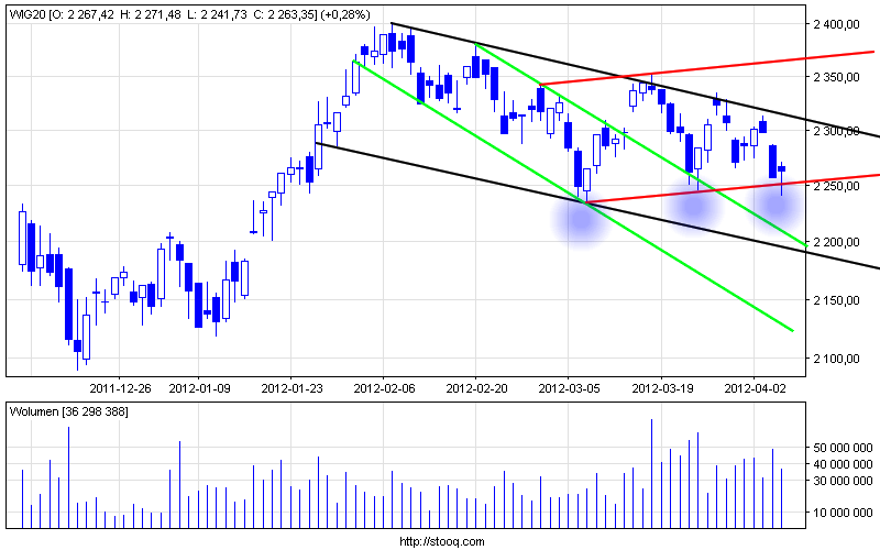 Załóżmy że czwartkowe wyciągniecie na żenujacym obrocie mogło być fałszywką, dalsze dołowanie na świecie i wynikający z tego brak białej wtorkowej świeczki będzie pierwszym ostrzeżeniem a przejście w dół poziomu 2235-2250 potwierdzi dominację czarnego kanału i aktualnie panujący trend. Wtedy najbliższymi wsparciami wydają się okolice poziomów 2190 gdzie mamy czarną spadkową i szybszą zieloną i dopiero tam popyt powinien zaatakować poważniej.