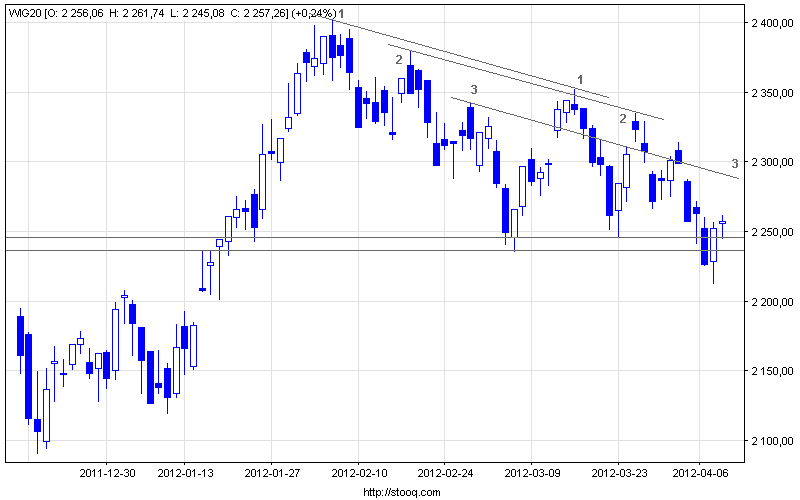 Pierwsza godzina handlu przebiegła zgodnie z obowiązującym scenariuszem spadkowym, jednak zbliżenie się WIG20 do "oczywistego" poziomu wsparcia na 2200 sprowokowało odbicie, które wyniosło indeks ponad strefę 2235-2246.