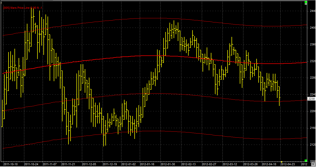 Na wykresie z liniami Marsa widać dokładnie to czego obawiałem się w poprzednim komentarzu. Odbicie od wsparcia nie doszło nawet do pierwszego oporu, co skutkuje kolejnym testem na koniec tygodnia. Tak jak już wspomniałem ten może być trudniejszy dla byków. Jakieś odbicie na początku tygodnia być może zobaczymy ale ja osobiście jestem pesymistą co do dalszej kondycji indeksu i kontraktów. Optymiści mogą doszukiwać się podwójnego dna, jednak o tym będzie można mówić dopiero w przypadku odbicia powyżej maksimów z mijającego tygodnia. Do tego momentu to po prostu chciejstwo.