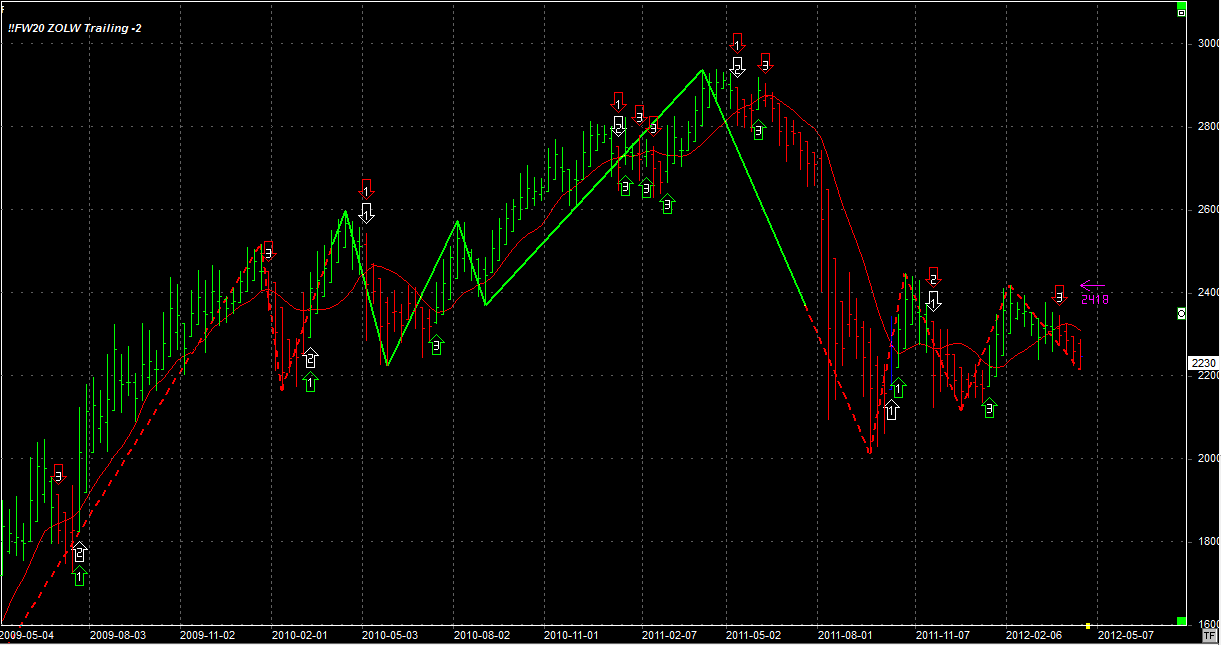 System utrzymuje 2 krótkie pozycje po 2282 pkt., ze stopem na 2418 pkt