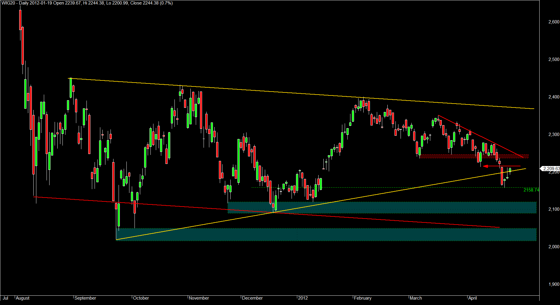 W kontekście trójkąta symetrycznego widzimy zarys fałszywego wybicia figury co premiuje w tym układzie stronę popytową.