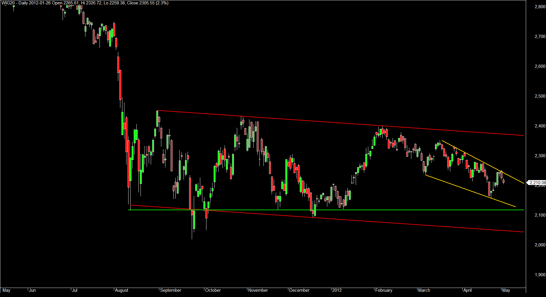 Możliwe , że w zamiarze rynku test dolnego ograniczenia (ok.2054) oznaczonego kanału jest realnym scenariuszem zdarzeń. Nie mniej fakt , że kanał ma nachylenie w dół a cena weszła w niego spadkiem, wzbudza lekko pozytywne oczekiwania co do zasadniczego kierunku wyjścia z tego boczniaka. Od góry istotnym punktem wykresu w krótkiej perspektywie jest górne ograniczenie naszkicowanego klina , jest to zarazem najszybsza kreska trendowa . O jej istotności niech świadczy fakt 5-cio krotnego testu tej kreski. Świeca popytowa dzienna z 27.04 o dużym korpusie nie została jeszcze zanegowana , więc jej oddziaływanie jest aktualne.