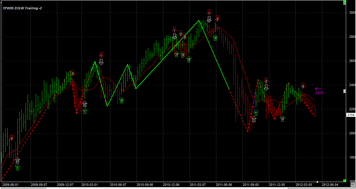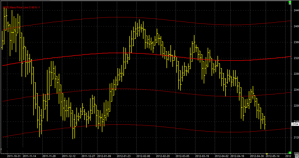 Na wykresie z liniami Marsa mamy dokładne odzwierciedlenie tego co napisałem w prognozie w zeszłym tygodniu, czyli zejście i testowanie wsparcia na linii Marsa w okolicach 2140 pkt. W mijającym tygodniu kontrakty testowały tę linie dwa razy - dokładne odczyty minimów to 2142 pkt i piątkowe 2141 pkt. Oba te testy jak na razie zakończyły się pozytywnie dla byków ale sytuacja komfortowa nie jest. Odejścia wzrostowe są minimalne i jakiś negatywny news (nowe wybory w Grecji?) może tę linie zmieść ze stołu.