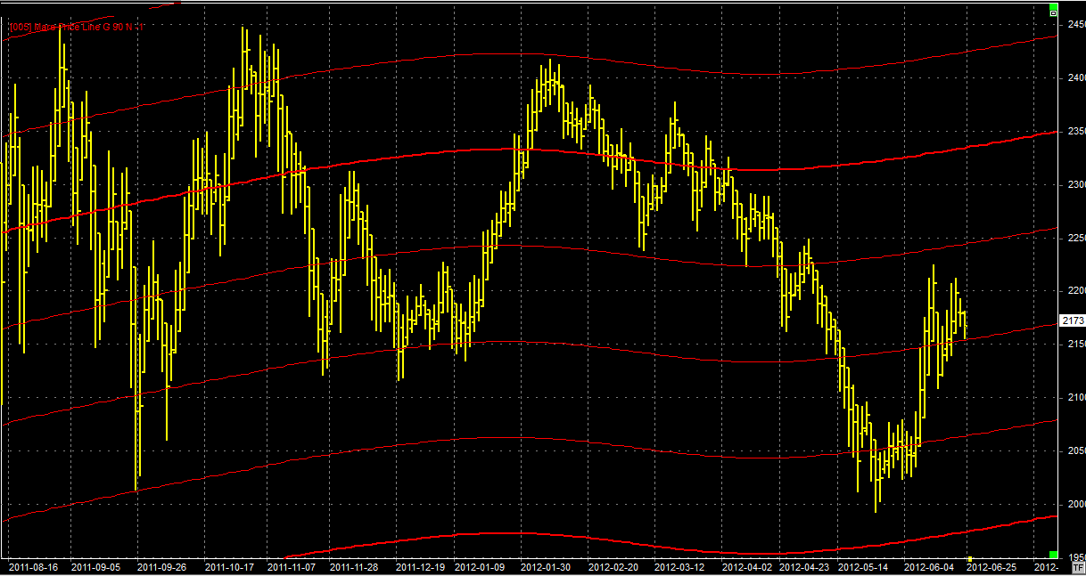 Na wykresie z liniami Marsa widać walkę o utrzymanie wsparcia położonego w okolicach 2150 pkt. Wydaje się, że byki kontrolują sytuację i zdejmą podaż bez przełamania tego poziomu. Jeżeli to się uda to czeka nas ruch w okolice 2250 pkt i w dalszej perspektywie 2350 pkt. Nieutrzymanie obecnych poziomów spowoduje zawód u byków i nerwowość podaży. W takim wypadku możemy się cofnąć do poziomu poniżej 2100 pkt.
