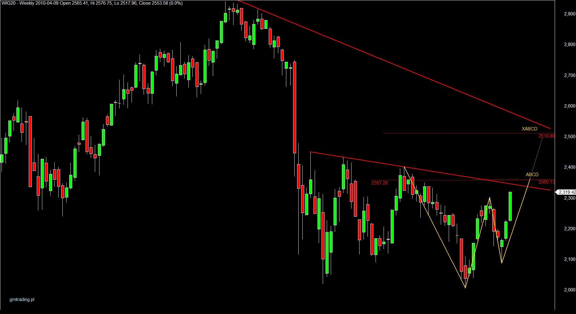 Potencjalne dwie formacje harmoniczne pro-spadkowe ABCD i XABCD (jedna wbudowana w drugą) , które przybliżą nas w ocenie czy mamy do czynienia z korektą czy może z nowym impulsem. LOP od 2.08 napędza obecne wzrosty nowym paliwem takiego symptomu nie można lekceważyć. Nasz rynek zaczyna poruszać się w oderwaniu od rynków cywilizowanych gdzie zaczynają wchodzić korekty. W układzie dziennym weszliśmy w strefy wykupienia co powinno zmobilizować podaż do działania .