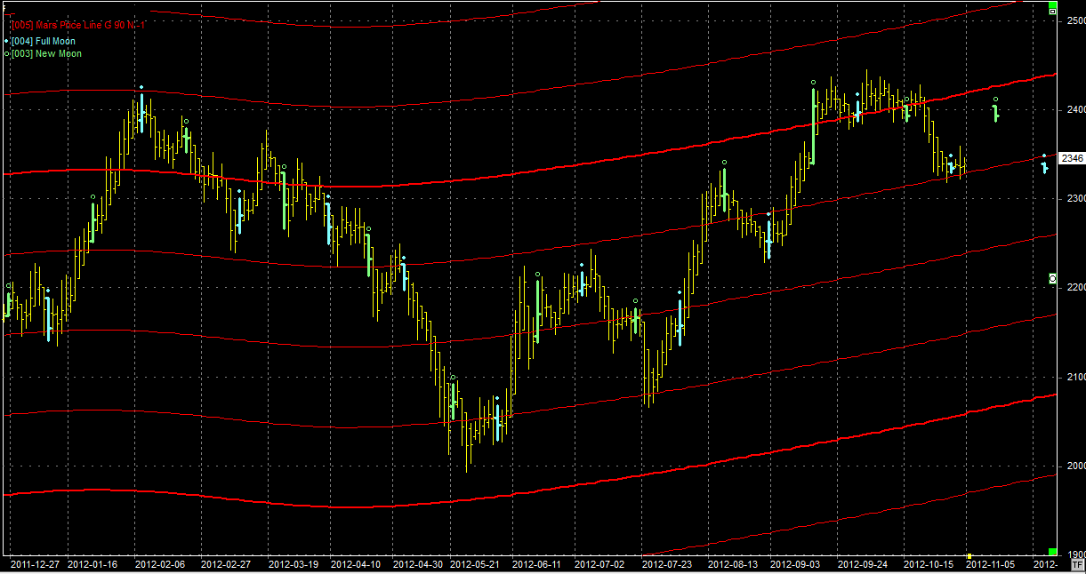 Na wykresie z liniami Marsa wsparcie jedynie powstrzymało spadki. Byki nie były w stanie wykreować większego odbicia a to źle prorokuje dla nich w nadchodzącym tygodniu. Sądzę, że czeka nas kolejny ruch spadkowy w okolice 2250 pkt.