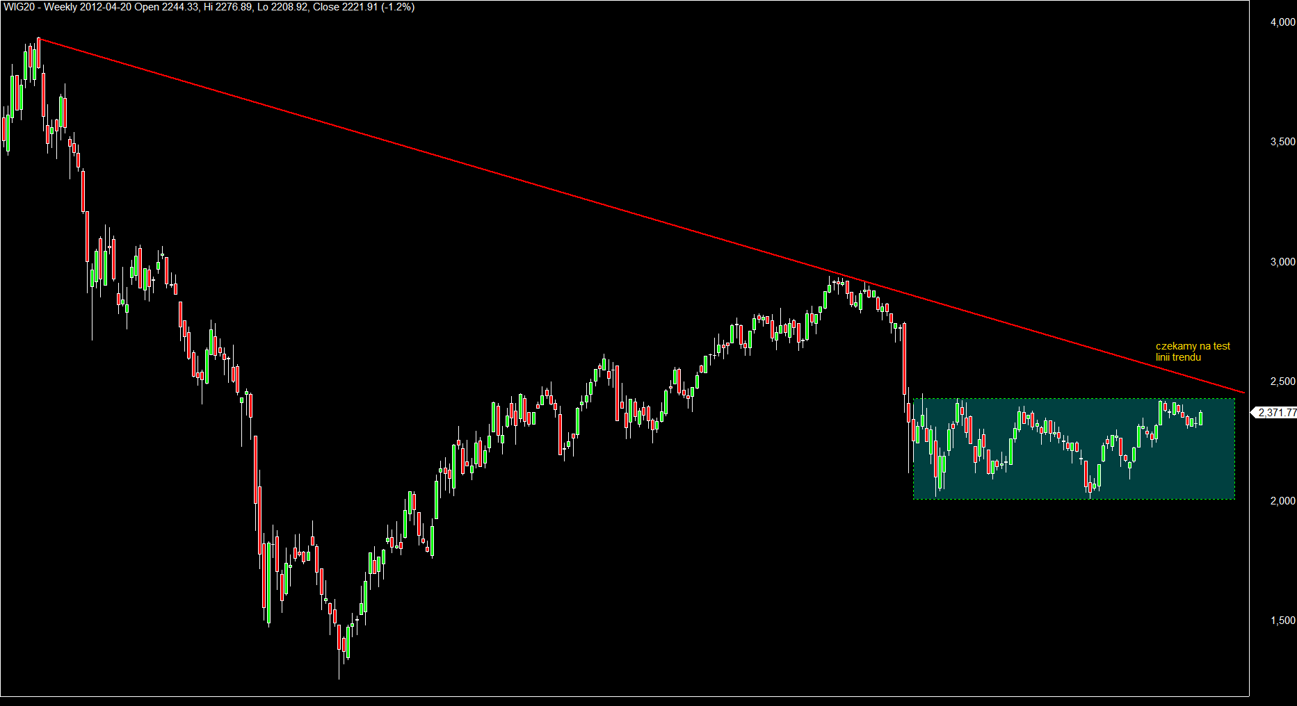 Nie ma co sobie łamać głowę nad układami dziennymi , jesteśmy w konsolidacji a nad nami silny magnes w postaci długoterminowej linii trendu spadkowego. Albo robimy kolejne podejście pod dolne ograniczenie konsolidacji albo wybijamy zwierza i jedziemy z koksem na te krechę czerwoną :) Preferowany scenariusz to koks i krecha