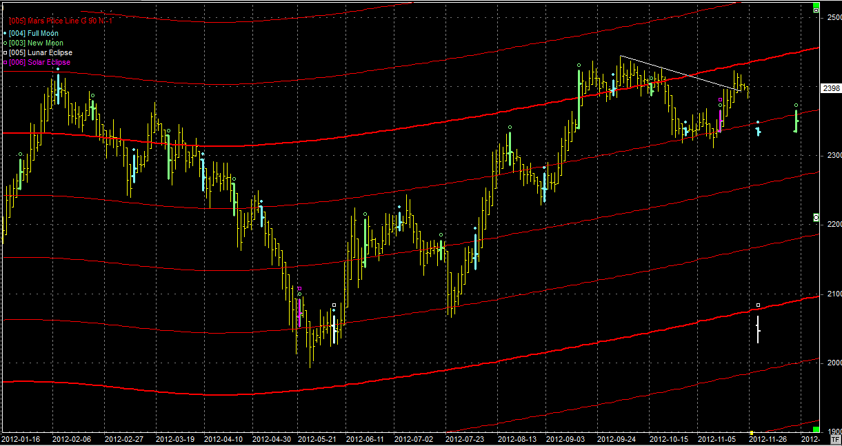 Na wykresie z liniami Marsa mamy niewielkie odejście od oporu na poziomie 2430 pkt. Nie jest one duże więc najprawdopodobniej w tym tygodniu zobaczymy jeszcze jeden atak na ten poziom. Problem w tym, że linia Marsa unosi się w górę więc dotarcie do niej wymaga coraz większej determinacji byków. Ponadto 28 listopada mamy pełnię na zaćmieniu Księżyca. Może to być punkt zwrotny. W kierunkach aspektów nie jestem mocny więc niech się wypowiedzą specjaliści. Faktem jest, że pełnia i zaćmienie nie zdarzają się często.