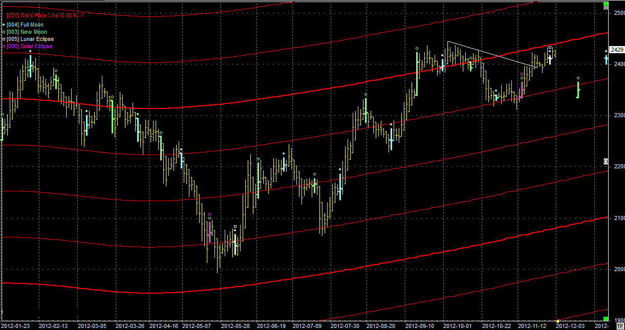 Na wykresie z liniami Marsa walczymy z oporem na linii Marsa położonej w okolicach 2440 pkt. Linia ta unosi się więc z każdym dniem opór jest coraz wyżej. Przypominam, że jest to linia, która poprzednio trzymała rynek przez prawie miesiąc więc nie spodziewam się szybkiego jego pokonania. Sądzę, że możemy odejść w dół do najbliższego wsparcia, ewentualnie pełznąć w górę wraz ze wznoszącą się linią. To jednak również z czasem skutkowałoby odejściem spadkowym. Ewentualne pokonanie oporu to silny sygnał kupna i ruch co najmniej w okolice 2600 pkt.