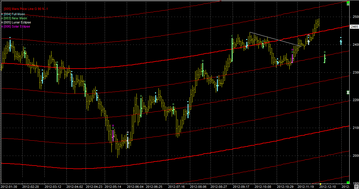Na wykresie z liniami Marsa rynek jednak się uporał z oporem na linii w okolicach 2450 pkt. Ku mojemu zaskoczeniu muszę dodać. Cóż, mylić się rzeczą ludzką jest... Wyjście jest na tyle zdecydowane, że obecnie można spodziewać się ruchu w okolice następnej linii Marsa położonej w okolicach 2550 pkt. Linie Marsa obecnie unoszą się ku górze więc z każdym dniem ten opór "ucieka" do góry. Zejście poniżej przełamanego niedawno oporu będzie wg mnie sporym zawodem byków i skutkować będzie najprawdopodobniej o dwa piętra w dół lub więcej. W czwartek 13 grudnia mamy Nów.