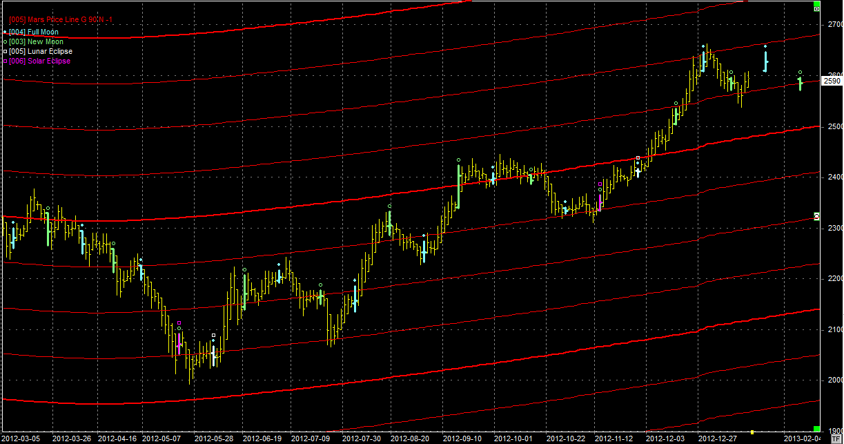 Na wykresie z liniami Marsa widać jak na dłoni techniczną obronę wsparcia położonego w okolicach 2570 pkt. Na razie odejście nie jest jeszcze znaczące więc możliwy ponowny test. Dopiero jego powodzenie moim zdaniem pozwoli na ruch w kierunku oporu na linii Marsa położonej w okolicach 2650 pkt. Bezpośredni marsz świadczyłby o sile byków lub jakimś pozytywnym newsie. Taki może się pojawić 23.01, kiedy wyniki podaje Apple. Dobrze przyjęte mogą spowodować dość silny ale, wg mnie, krótkotrwały wyskok. Złe dane (których jak się spodziewam) to wspomniany wyżej re-test wsparcia. Pozytywny wynik to kontynuacja ruchu w górę. Negatywny to jazda windą w dół co najmniej o dwa piętra.