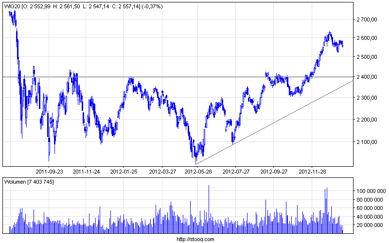 Okolice 2400 - b. dobry poziom na L. Zobaczcie przy szczytach na wolumen, gruby wypchnal towar. Aktualnie wolumen spada co swiadczy o korekcie a nie zmianie trendu. Rynek niemiecku bardzo dlugo sie konsoliduje, bedzie mocny ruch...