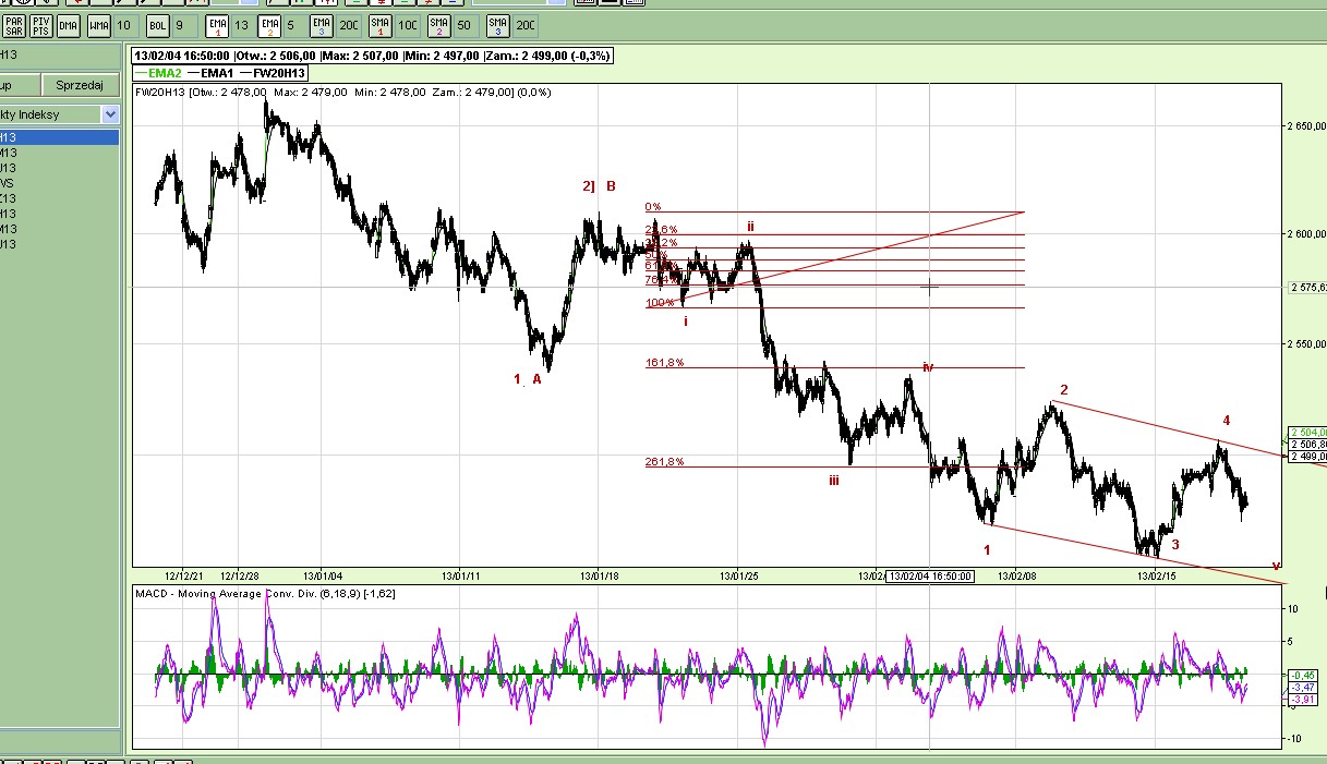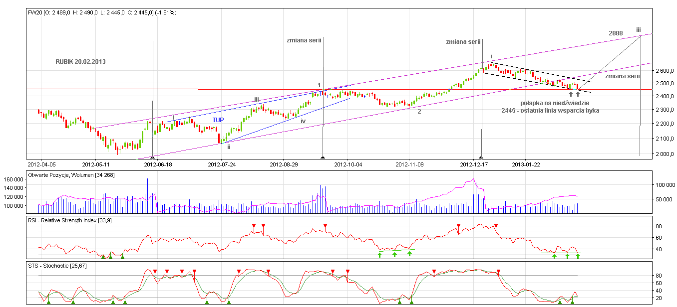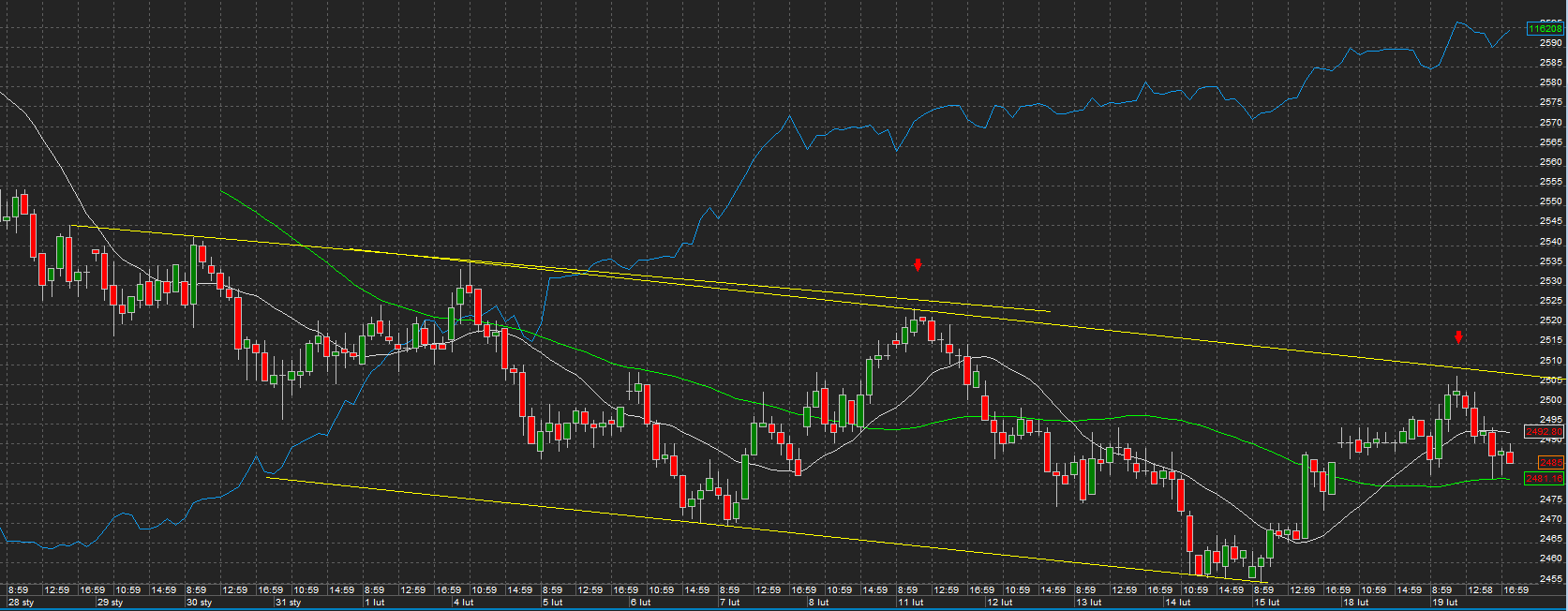 Siła rynku mierzona dwukrotnym niedojściem do najszybszej spadkowej (czerwone strzałki) nie pozostawia złudzeń - szansa na trwalsze wzrosty pojawi się nie wcześniej niż po przekopaniu górnej kreski.