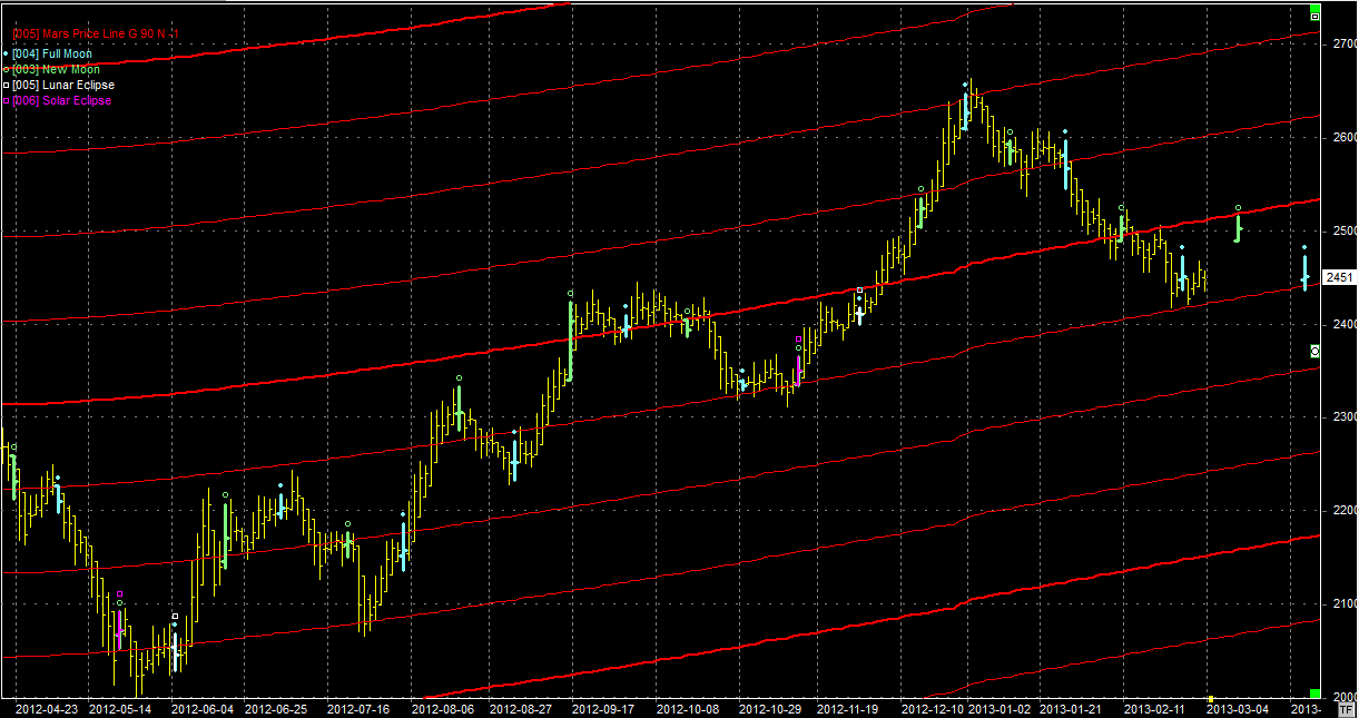 Na wykresie z liniami Marsa widać lekką obronę wsparcia położonego na linii w okolicach 2420 pkt. Kurs testował tę linie dwukrotnie i na razie się od niej odbijał. Odbicie nie jest jednak przekonujące. Jeżeli początek tygodnia nie przyniesie bardziej wyraźnego odejścia od oporu to linie będzie najprawdopodobniej testowana ponownie. Trzeciego testu może już nie wytrzymać, zgodnie z zasadą "two times test and breake". Jeżeli jednak bykom uda się od niej oddalić to następny opór znajduje się na linii Marsa położonej w okolicach 2520 pkt.