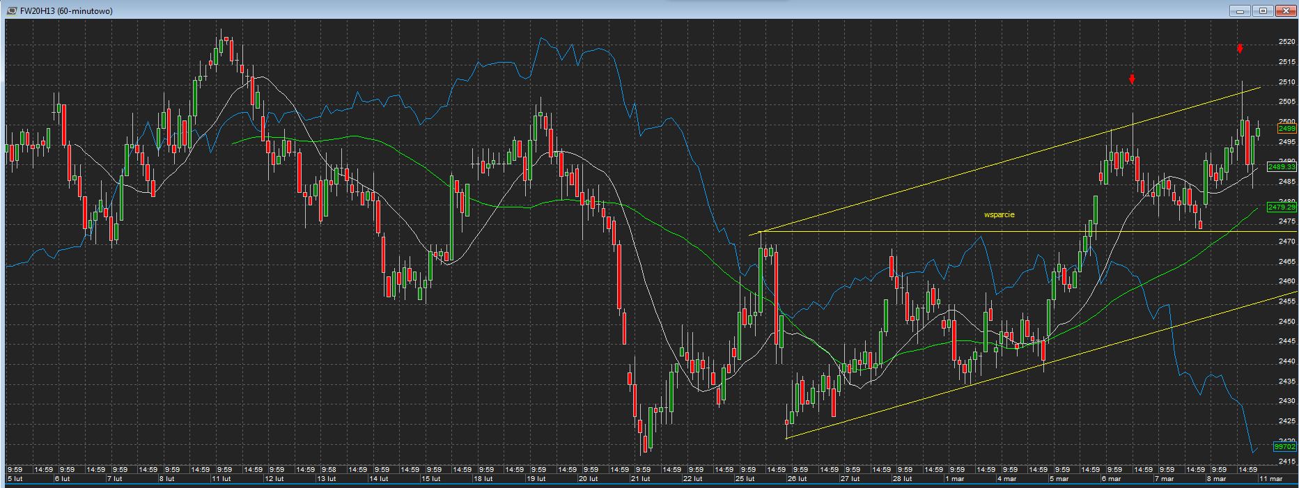 Nowy tydzień zaczynamy z jeden strony optymistycznie utrzymanym wsparciem 2473-74, z drugiej strony wydaje się, że prawie już ukształtowaną strukturą 5 falową z oczekiwaniami na dłuższą bądź krótszą korektę o czym świadczą dwa cienie na 3 i 5 - czerwone strzałki na wykresie poniżej