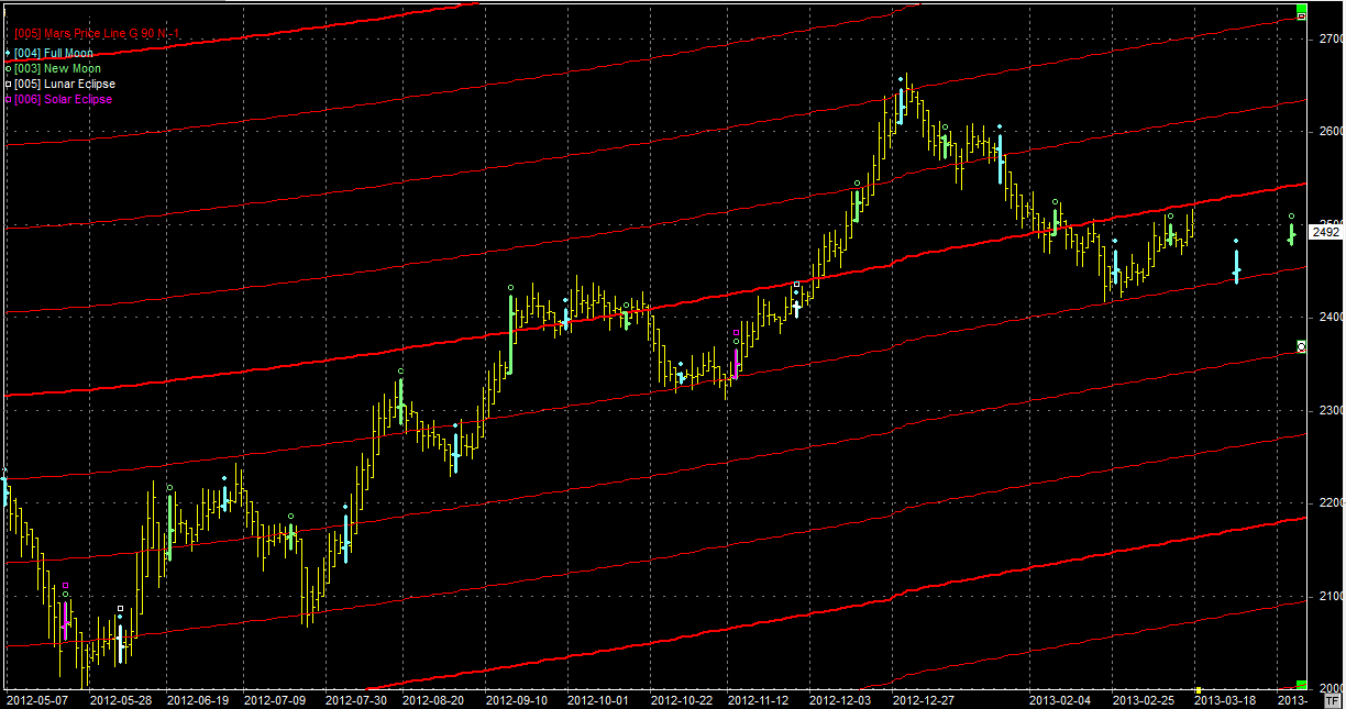 Na wykresie z liniami Marsa kurs dotarł do oporu i zawrócił dość dynamicznie. Dynamika zejścia może mieć podłoże w zamykaniu serii marcowej kontraktów ale i tak wskazuje na słabość byków w krótkim okresie. Nie wykluczam więc zejścia w okolice wsparcia na linii położonej w okolicach 2450 pkt.
