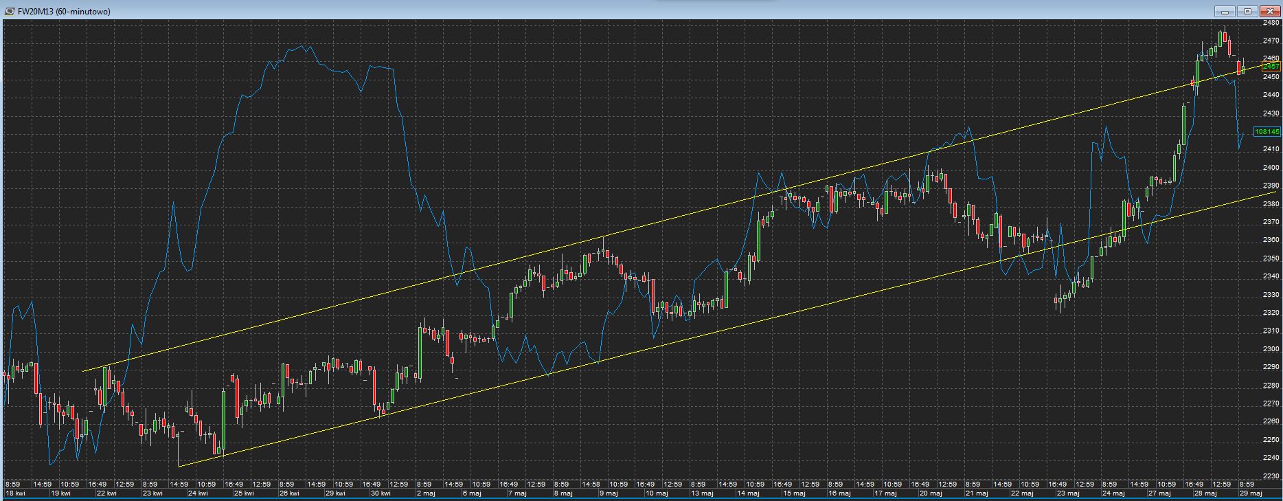 Trend wydaje się być niezagrożony (na wykresie fut 1h) a korekty są rzeczą naturalną, tym bardziej że jesteśmy u góry. Płytkie zejście będzie świadczyło o chęci dociągnięcia zdobyczy do końca miesiąca, zresztą niska aktywność w piątek sprzyja temu już od dziś.