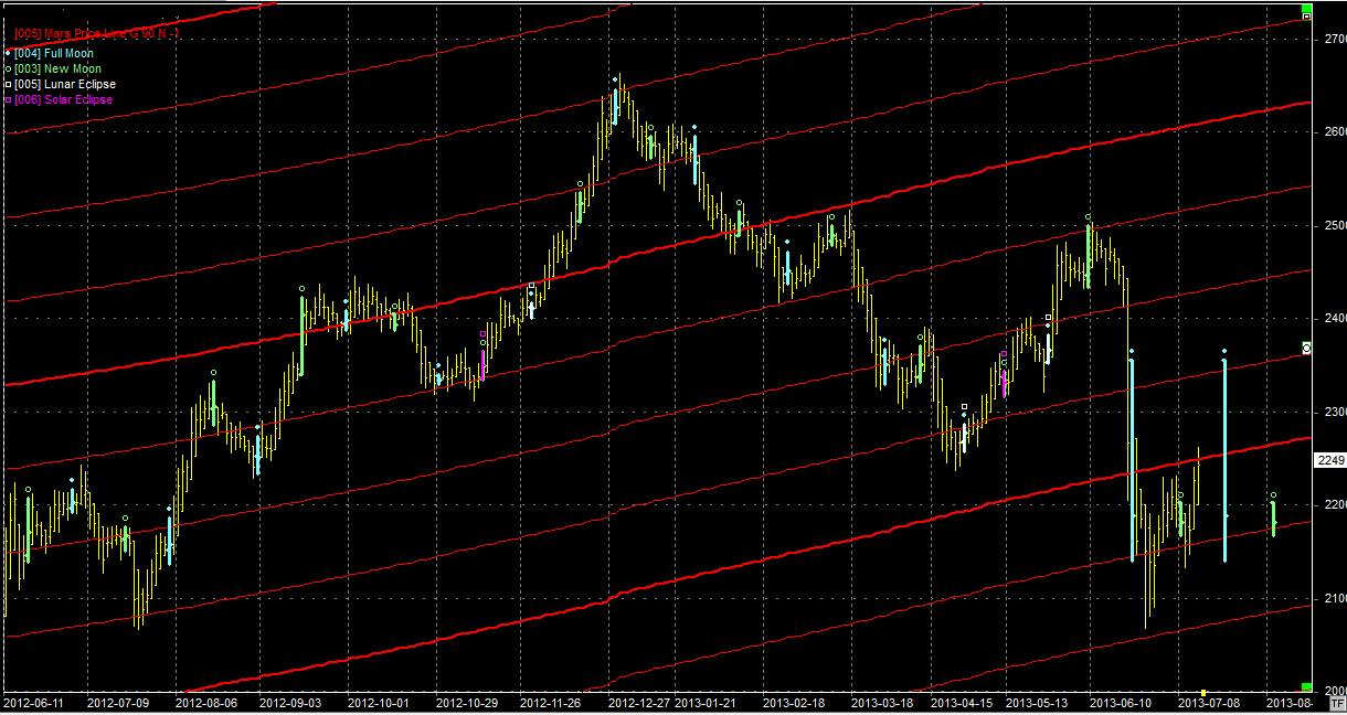 Na wykresie z liniami Marsa widzimy próbę sforsowania pierwszego oporu na poziomie 2250 pkt. Na razie próba nieudana. Jeżeli byki go szybko nie sforsują, to całe podejście zostanie uznanie za korekcyjny Zigzag, zapowiadający dalsze spadki. Pokonanie tego oporu może natomiast skutkować podejściem nawet w okolice 2350 pkt, a to zmieniłoby obraz rynku z niedźwiedziego na, co najmniej, neutralny.
