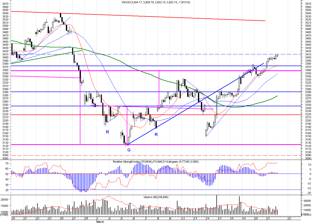 Trwa mozolne podnoszenie indeksu. Obroty dzisiaj by?y bliskie 1 mld – to znacznie wiŕcej ni? na pocz?tku tygodnia. Po wzroÂcie w pierwszej godzinie FW20M7 dotar? do istotnego oporu (61,8% zniesienia fali spadkowej (3555->3127 na FW) i utkn??. Indeks nadal powoli szed? w gˇrŕ co doprowadzi?o do rozci?gniŕcia ujemnej bazy. Zrobiono wiŕc kolejny krok ku szczytom. Opˇr do ktˇrego siŕ zbli?ono wydawa? siŕ dzisiaj silny, ale po takiej sesji w USA pewnie go jutro przeskoczymy. Kolejnej linii obrony nale?y siŕ spodziewaŠ na poziomach luki z 27 lutego (3469,31-3429,92 na WIG20)