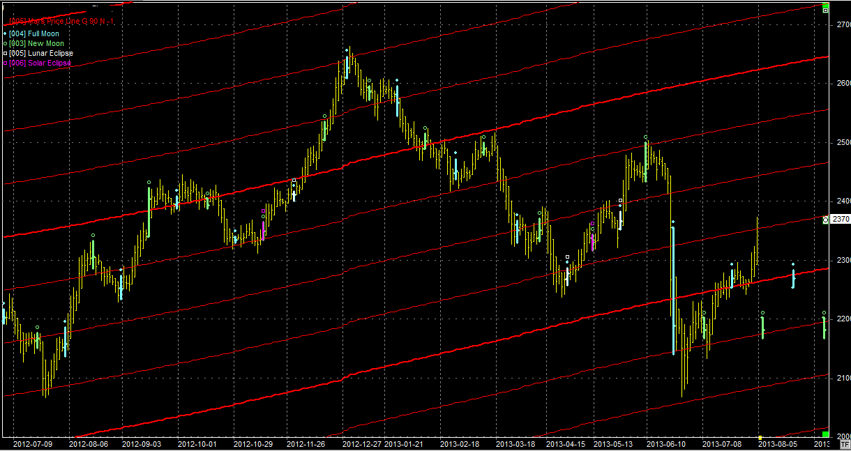 Jeżeli chodzi o wykres z liniami Marsa, to drugi atak na linię oporu położoną w okolicach 2260 pkt okazał się pełnym sukcesem byków. Rynek po pokonaniu tej linii dołożył do wyniku kolejne 100 punktów z okładem i znalazł się na kolejnym oporze, położonym na linii Masa w okolicach 2360 pkt. Linia ta jest już naruszona, więc teoretycznie droga do następnego oporu na poziomie 2450 pkt jest otwarta. Jest jednak jeden problem - Nów, który ma miejsce 6.08.13. Jest to element zwrotny, więc najprawdopodobniej w okolicach wtorku zobaczymy cofnięcie. Być może będzie to tylko cofnięcie do przebitego oporu na poziomie 2360 pkt, po ubiciu którego ruszymy dalej na północ. To jednak będzie zależeć od zachowania się indeksu właśnie na tym poziomie. Jeżeli go nie utrzymamy to czeka nas cofnięcie w okolice 2300 pkt.