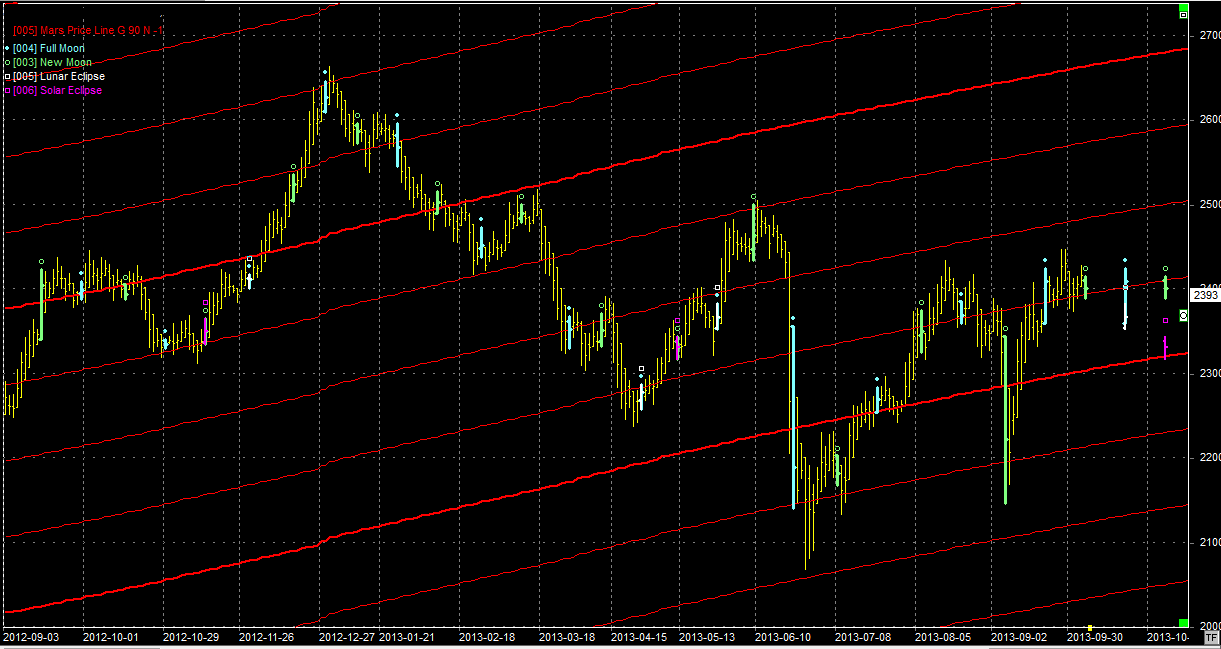 Na wykresie z liniami Marsa walka o przełamanie oporu położonego w okolicach 2400 pkt. Na razie jest ono naruszane zarówno w górę, jak i w dół. Wynik tej walki pokaże kierunek na dłużej.