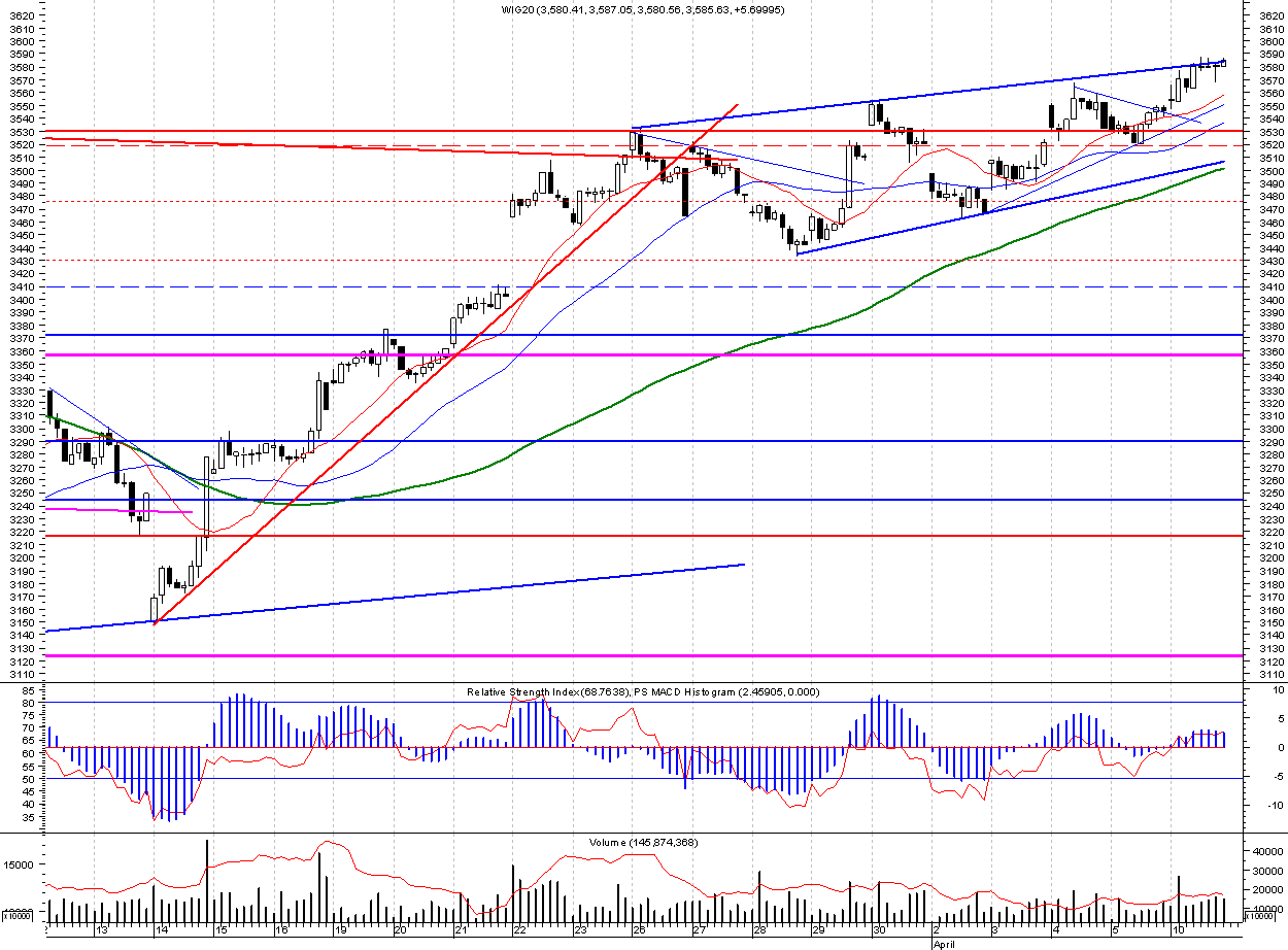 Przy obrotach wiŕkszych ni? przed Âwiŕtami WIG20 wzrˇs? dzisiaj o 1,09% i ustanowi? nowy rekord. Nie wybi? siŕ jednak z klina, ktˇry kreÂli od ponad dwˇch tygodni. Wzrost by? wynikiem wysokich cen miedzi.